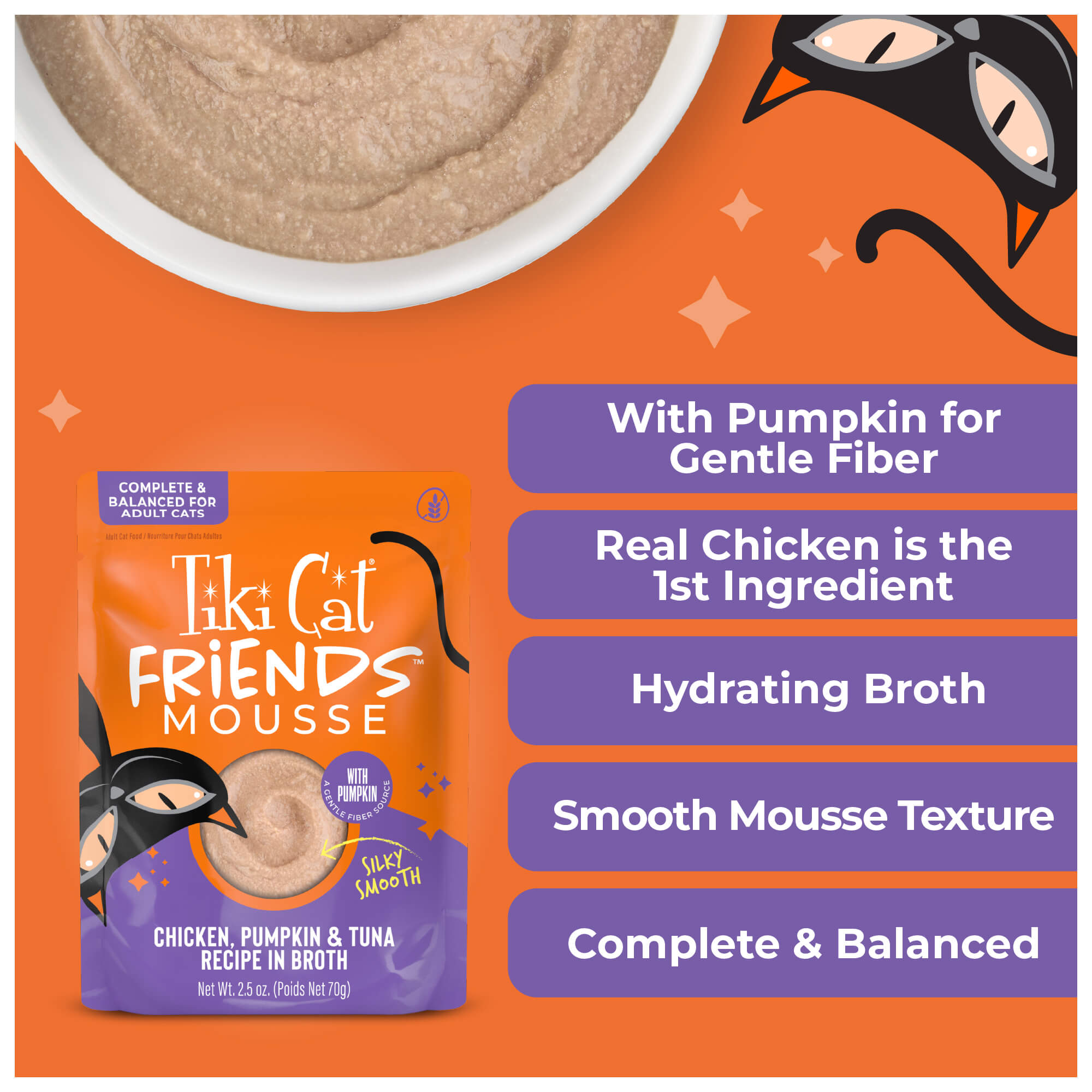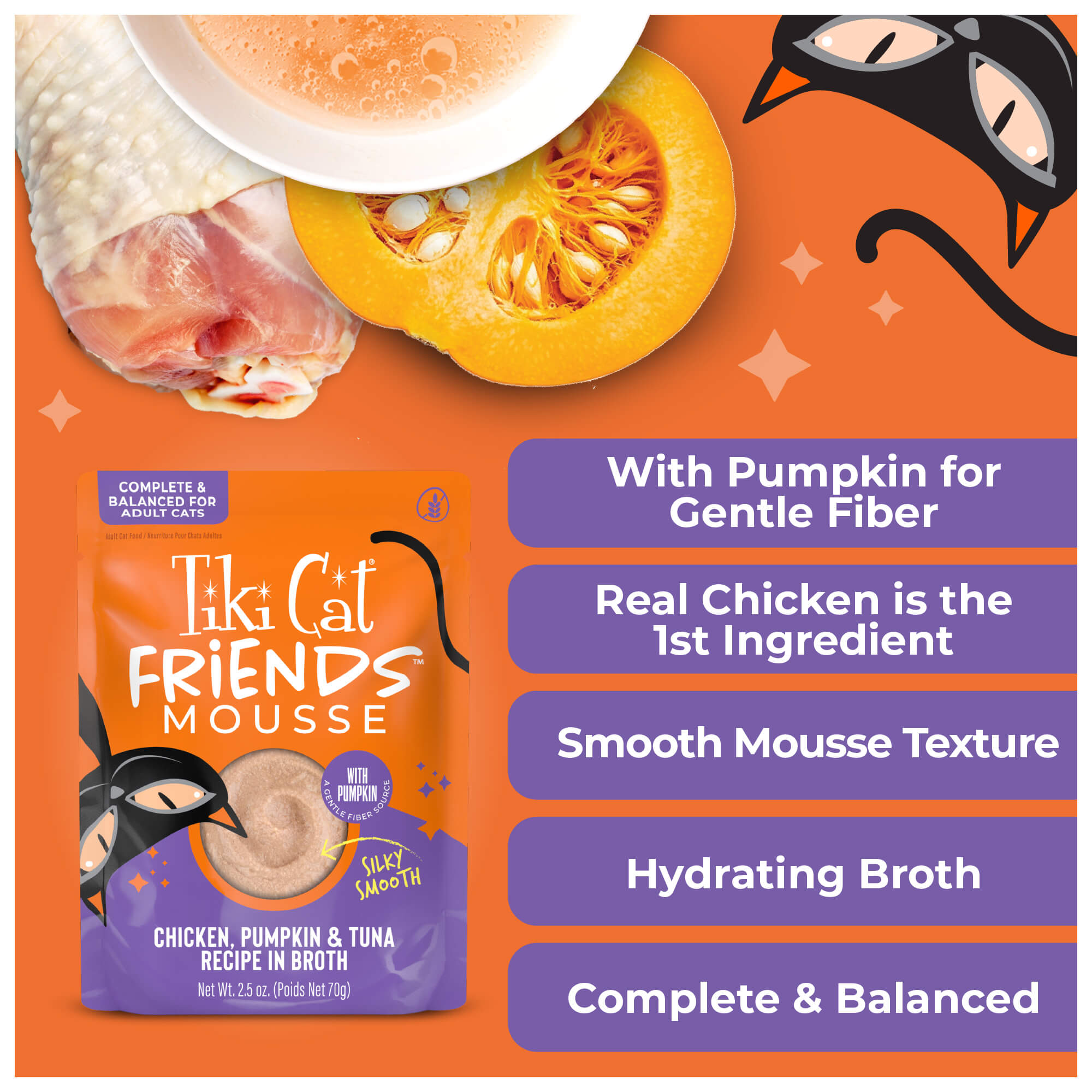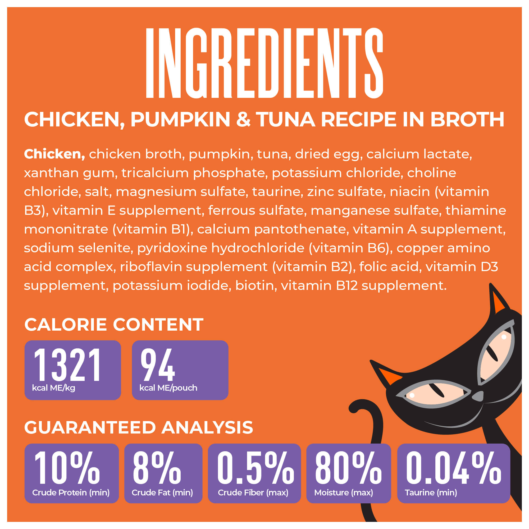 Chicken, chicken broth, pumpkin, tuna, dried egg, calcium lactate, xanthan gum, tricalcium phosphate, potassium chloride, choline chloride, salt, magnesium sulfate, taurine, zinc sulfate, niacin (vitamin B3), vitamin E supplement, ferrous sulfate, manganese sulfate, thiamine mononitrate (vitamin B1), calcium pantothenate, vitamin A supplement, sodium selenite, pyridoxine hydrochloride (vitamin B6), copper amino acid complex, riboflavin supplement (vitamin B2), folic acid, vitamin D3 supplement, potassium iodide, biotin, vitamin B12 supplement.