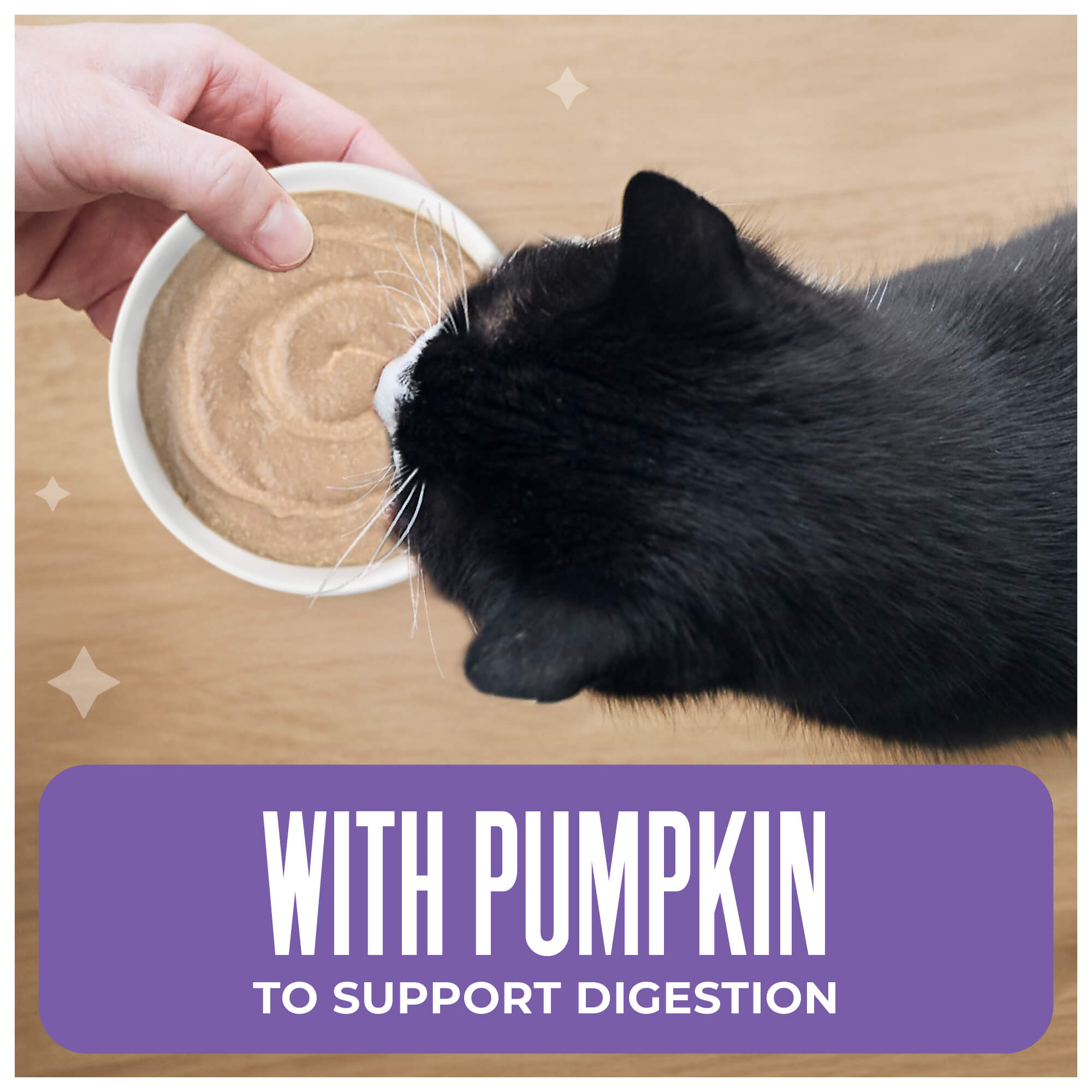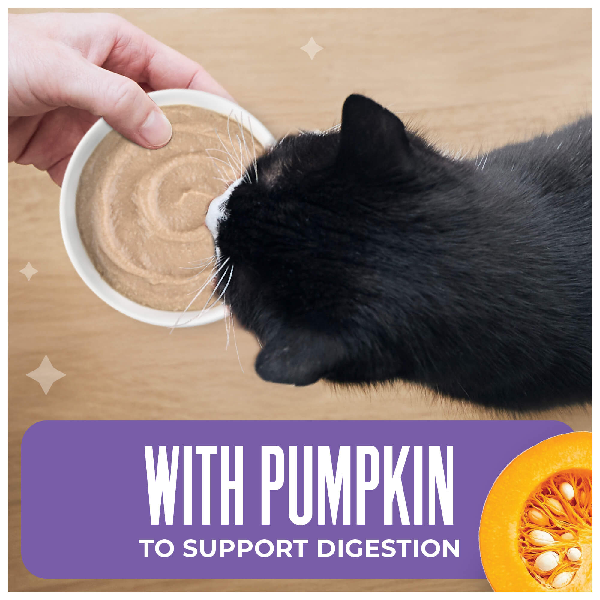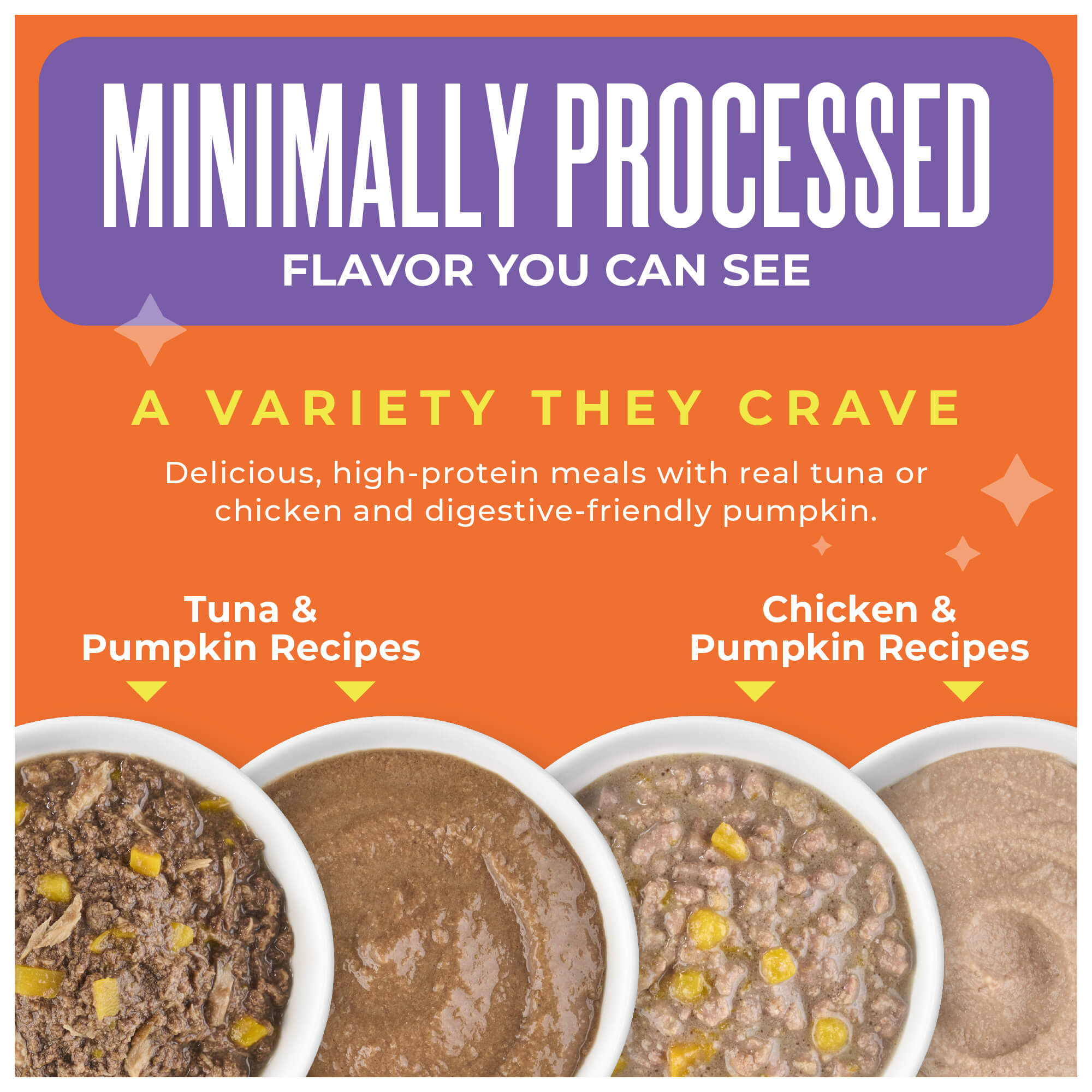 Chicken, chicken broth, pumpkin, tuna, dried egg, calcium lactate, xanthan gum, tricalcium phosphate, potassium chloride, choline chloride, salt, magnesium sulfate, taurine, zinc sulfate, niacin (vitamin B3), vitamin E supplement, ferrous sulfate, manganese sulfate, thiamine mononitrate (vitamin B1), calcium pantothenate, vitamin A supplement, sodium selenite, pyridoxine hydrochloride (vitamin B6), copper amino acid complex, riboflavin supplement (vitamin B2), folic acid, vitamin D3 supplement, potassium iodide, biotin, vitamin B12 supplement.