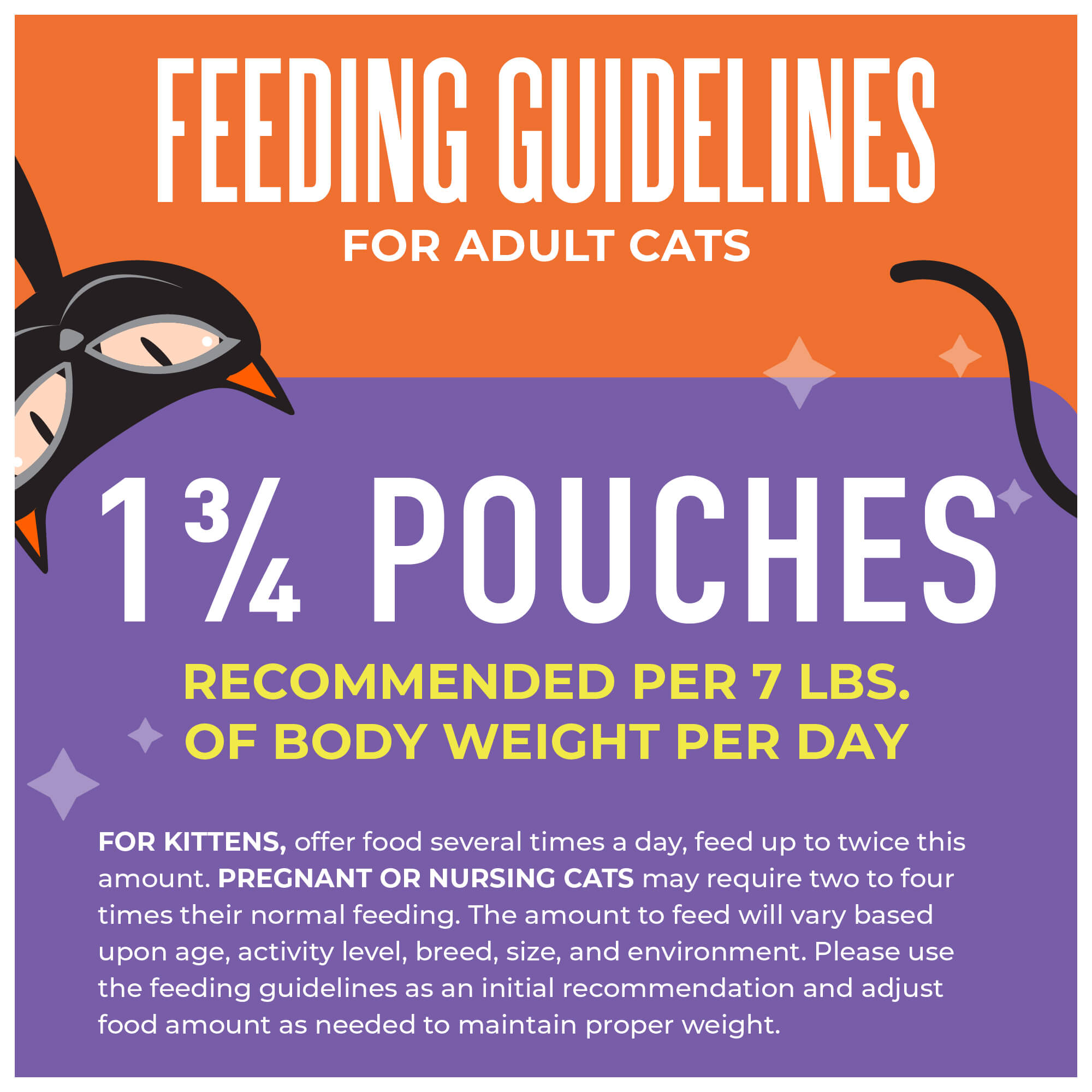 For adult cats, feed approximately 1 3/4 pouches per day per 7 lbs. of body weight.