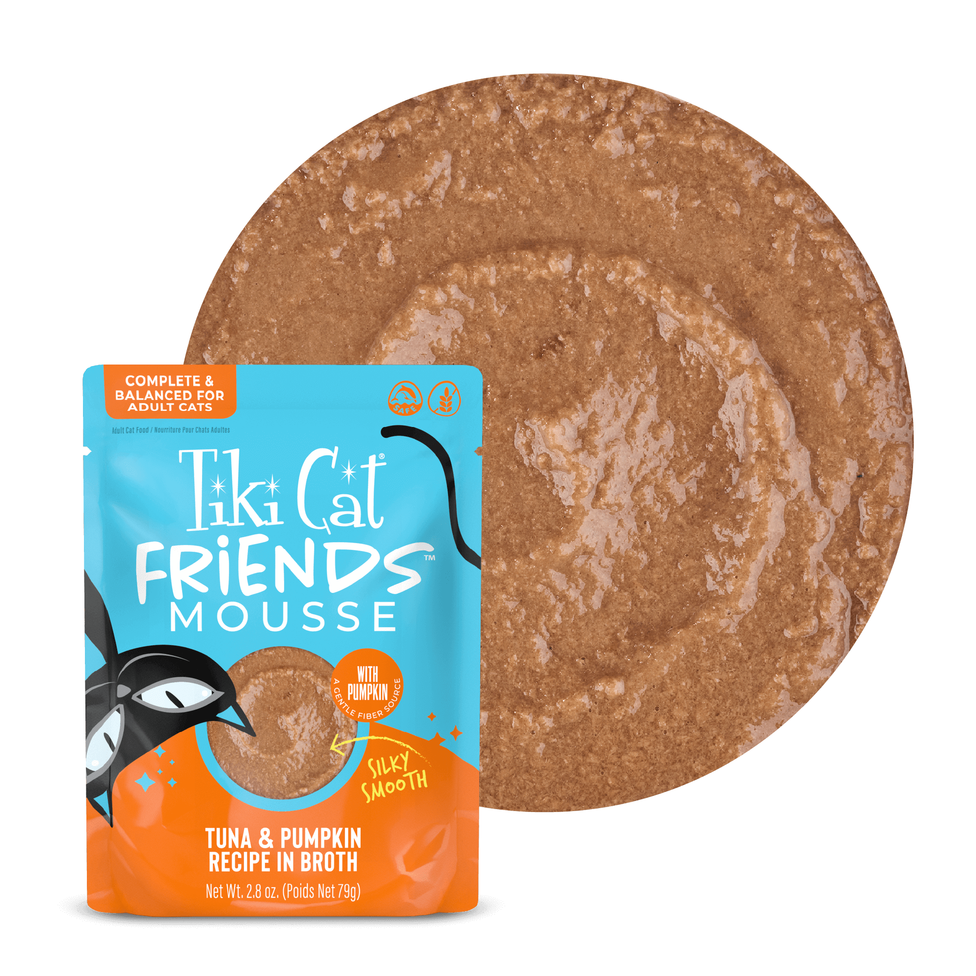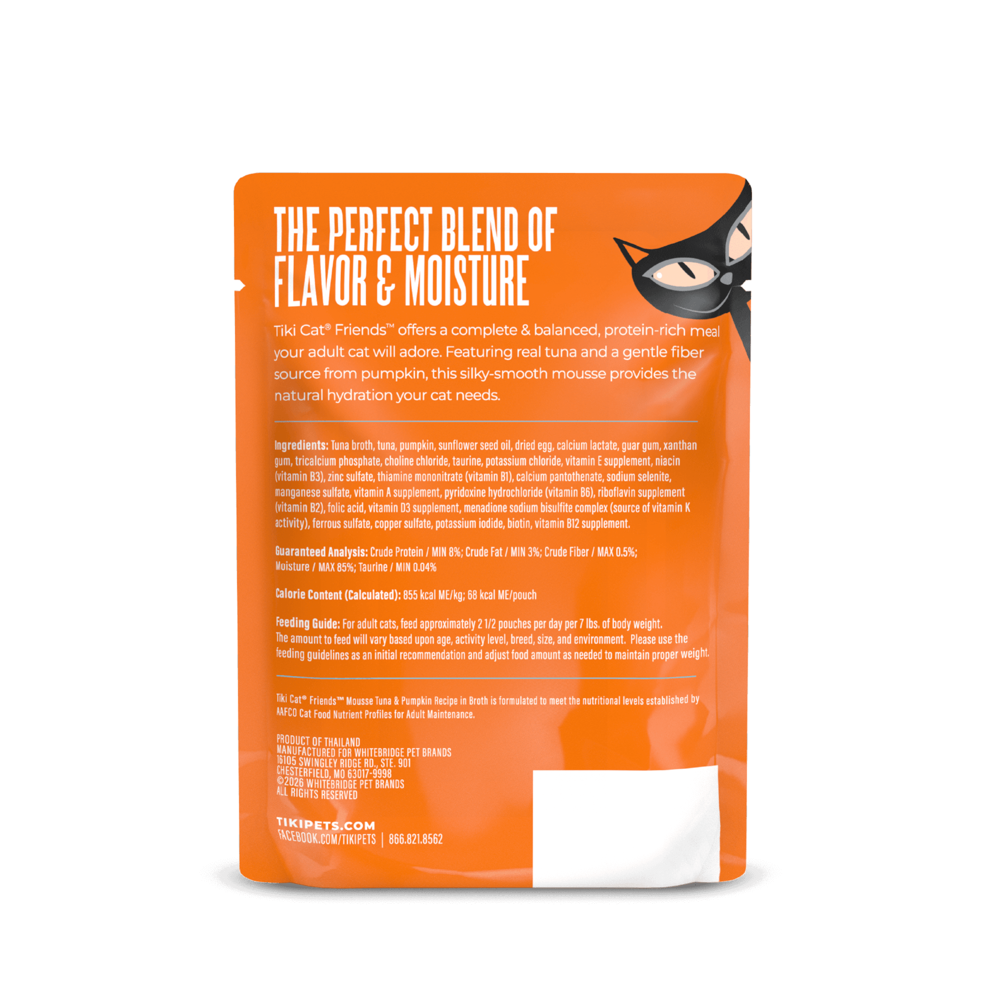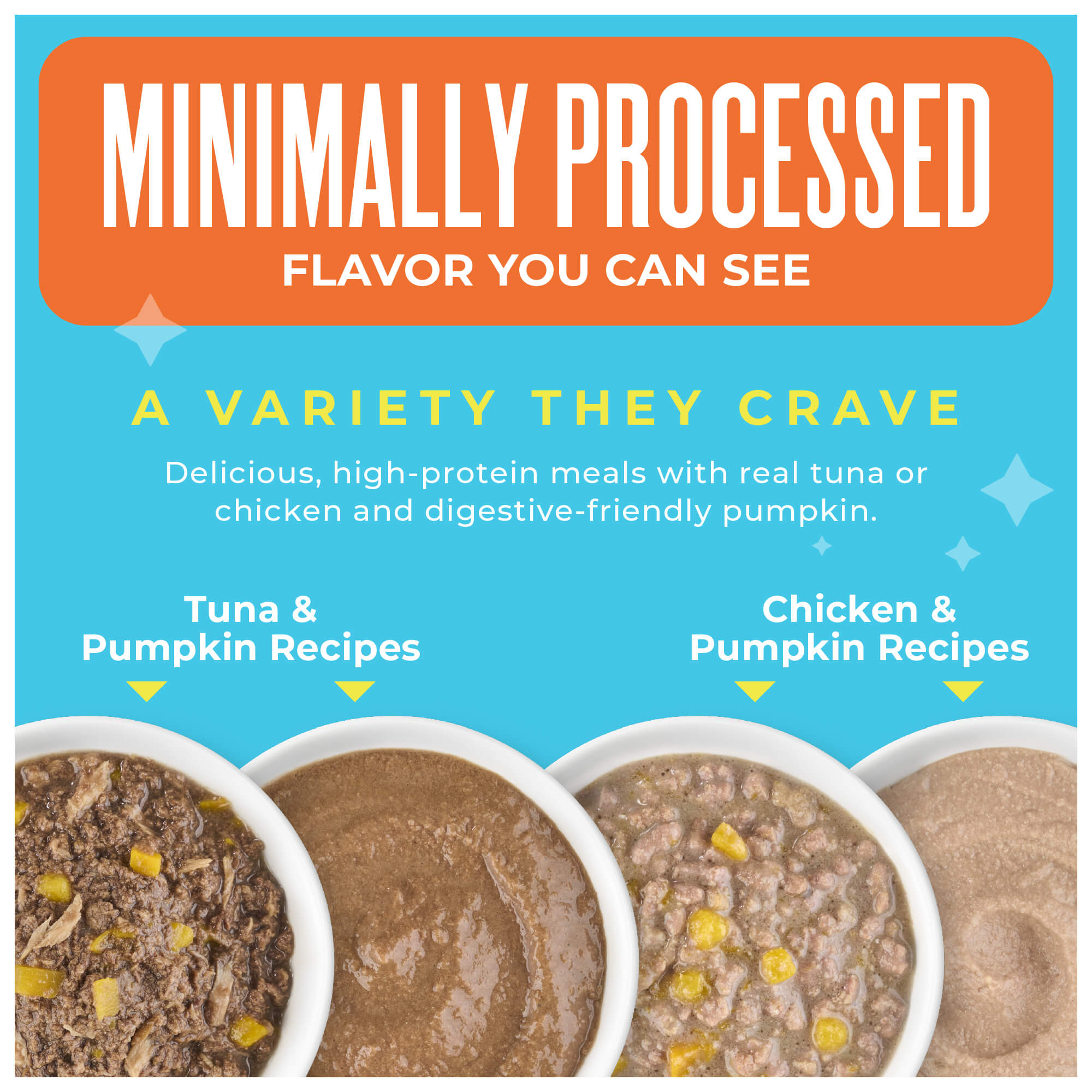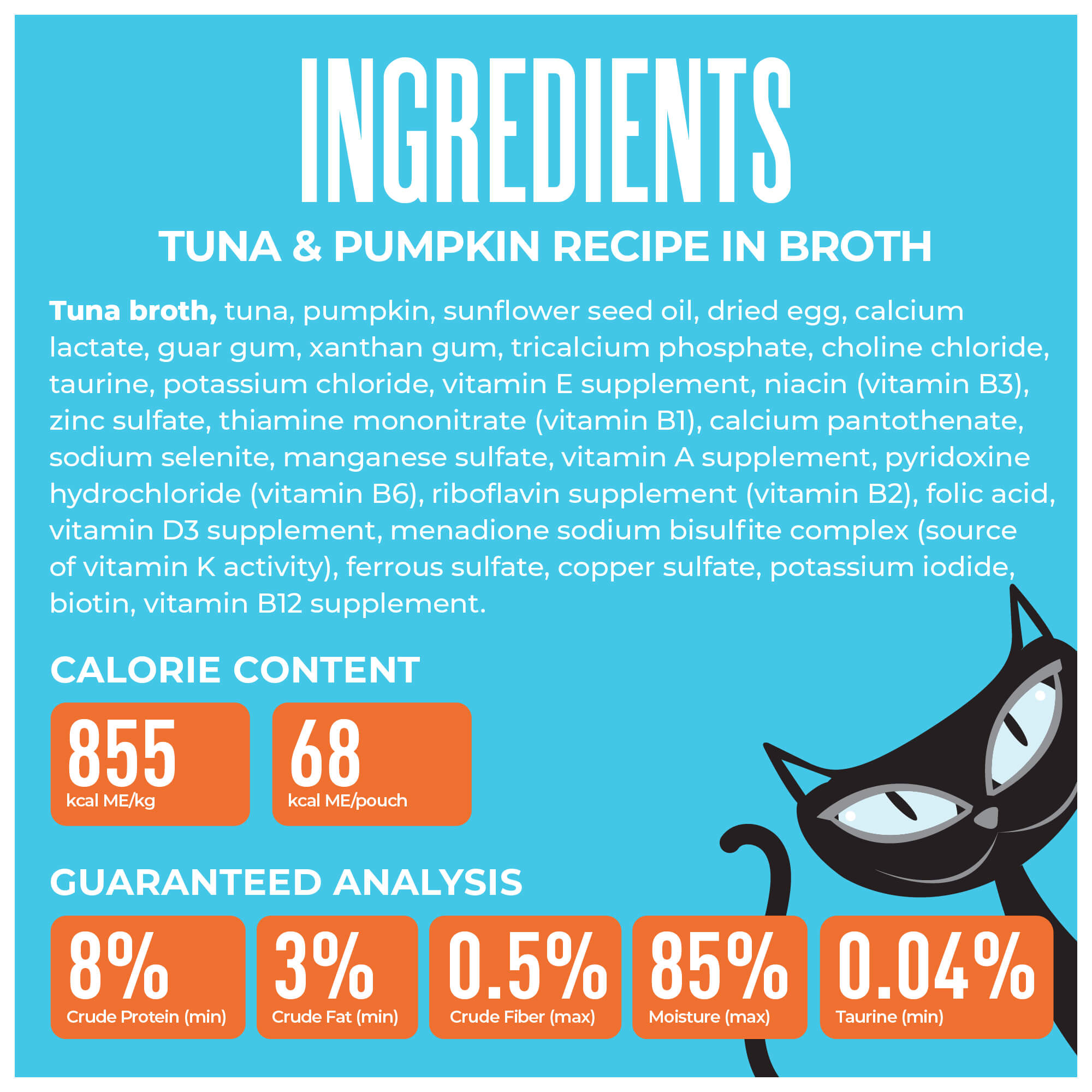 Tuna broth, tuna, pumpkin, sunflower seed oil, dried egg, calcium lactate, guar gum, xanthan gum, tricalcium phosphate, choline chloride, taurine, potassium chloride, vitamin E supplement, niacin (vitamin B3), zinc sulfate, thiamine mononitrate (vitamin B1), calcium pantothenate, sodium selenite, manganese sulfate, vitamin A supplement, pyridoxine hydrochloride (vitamin B6), riboflavin supplement (vitamin B2), folic acid, vitamin D3 supplement, menadione sodium bisulfite complex (source of vitamin K activity), ferrous sulfate, copper sulfate, potassium iodide, biotin, vitamin B12 supplement.