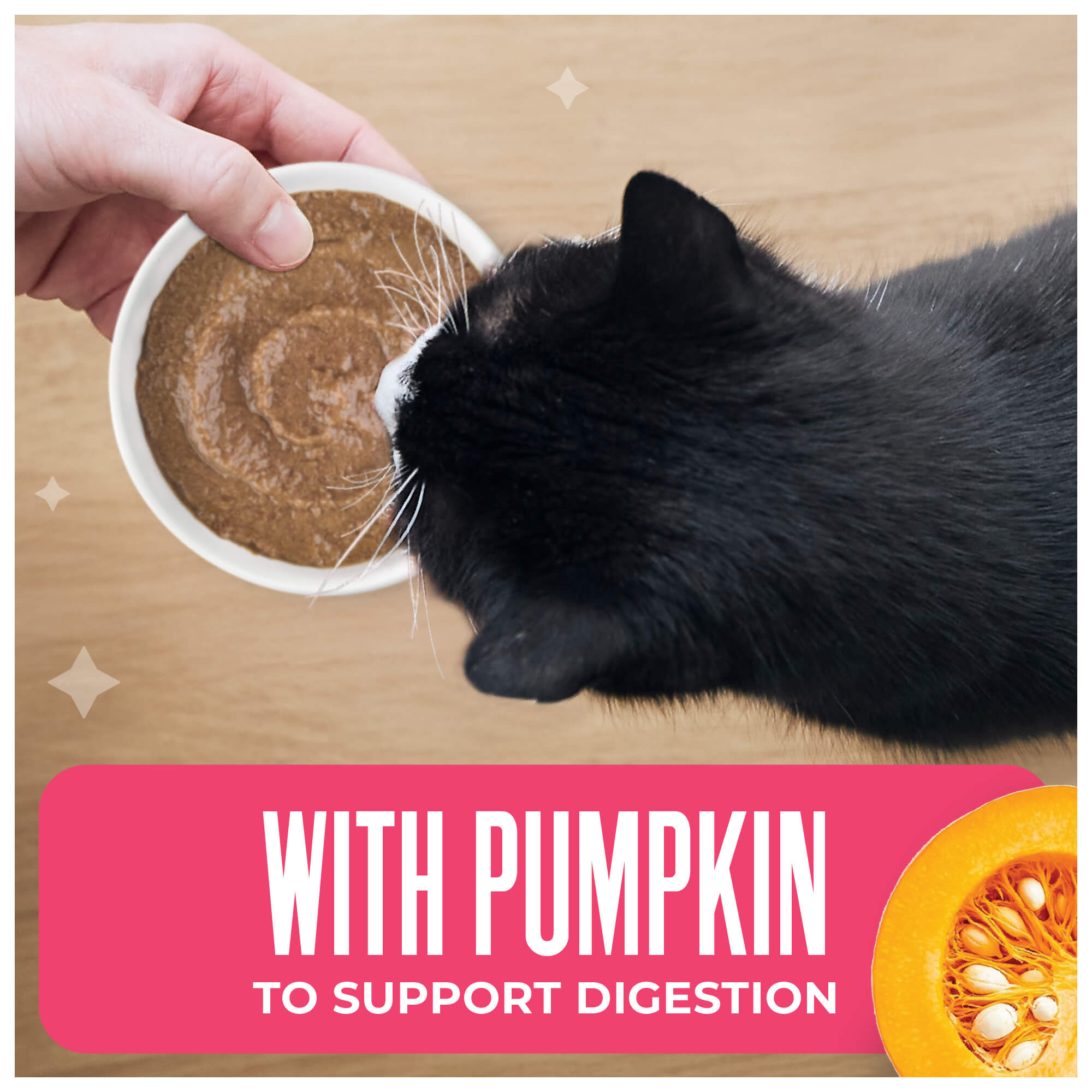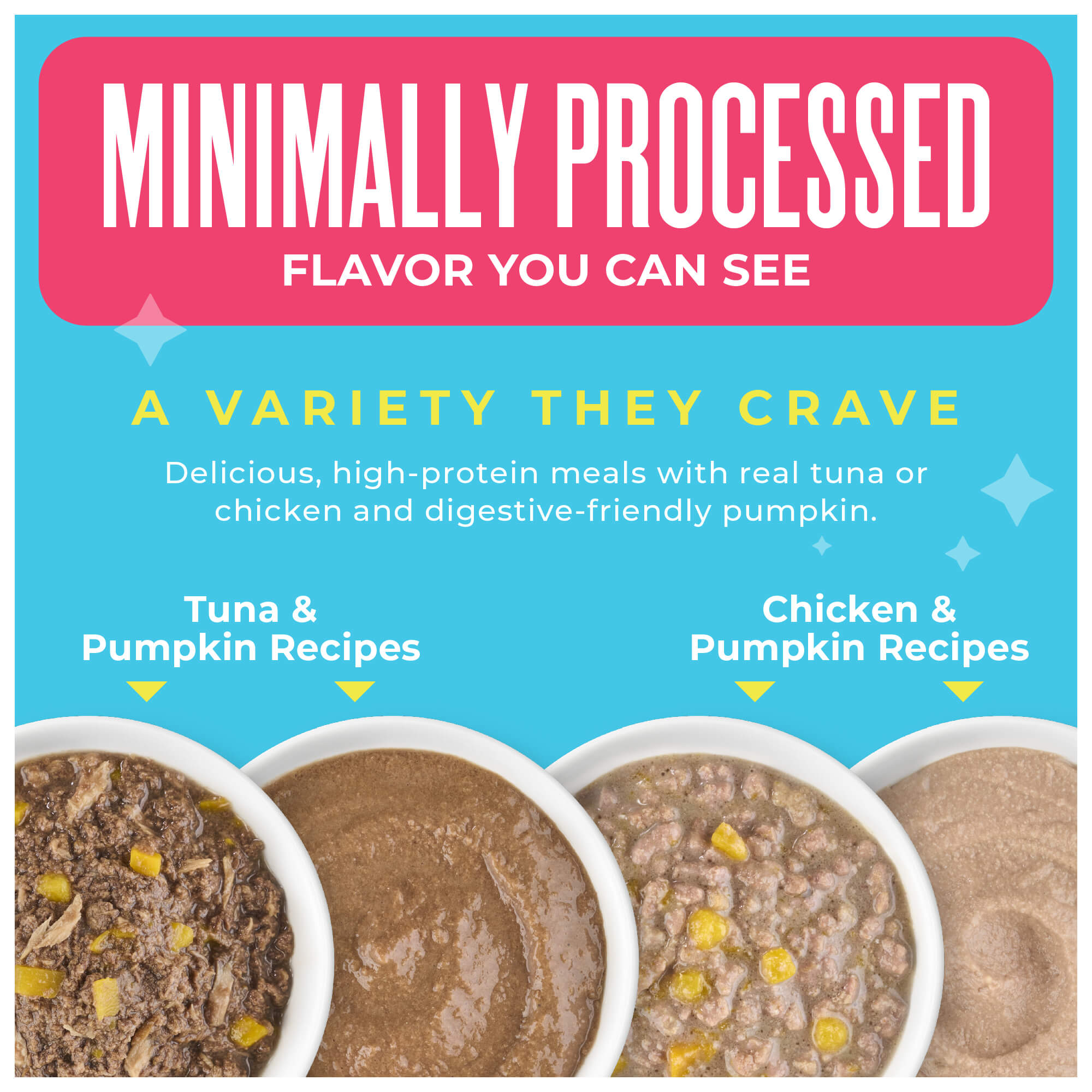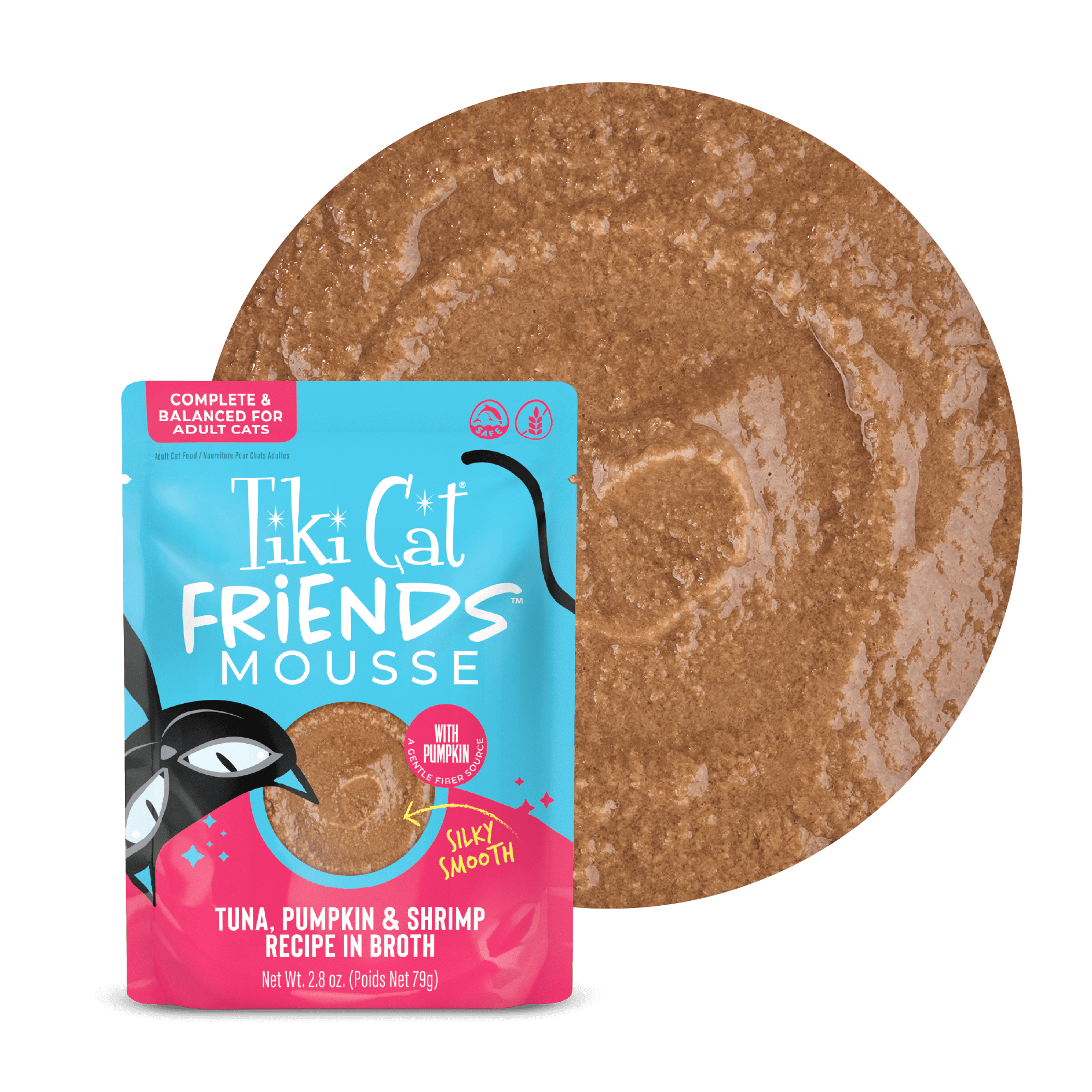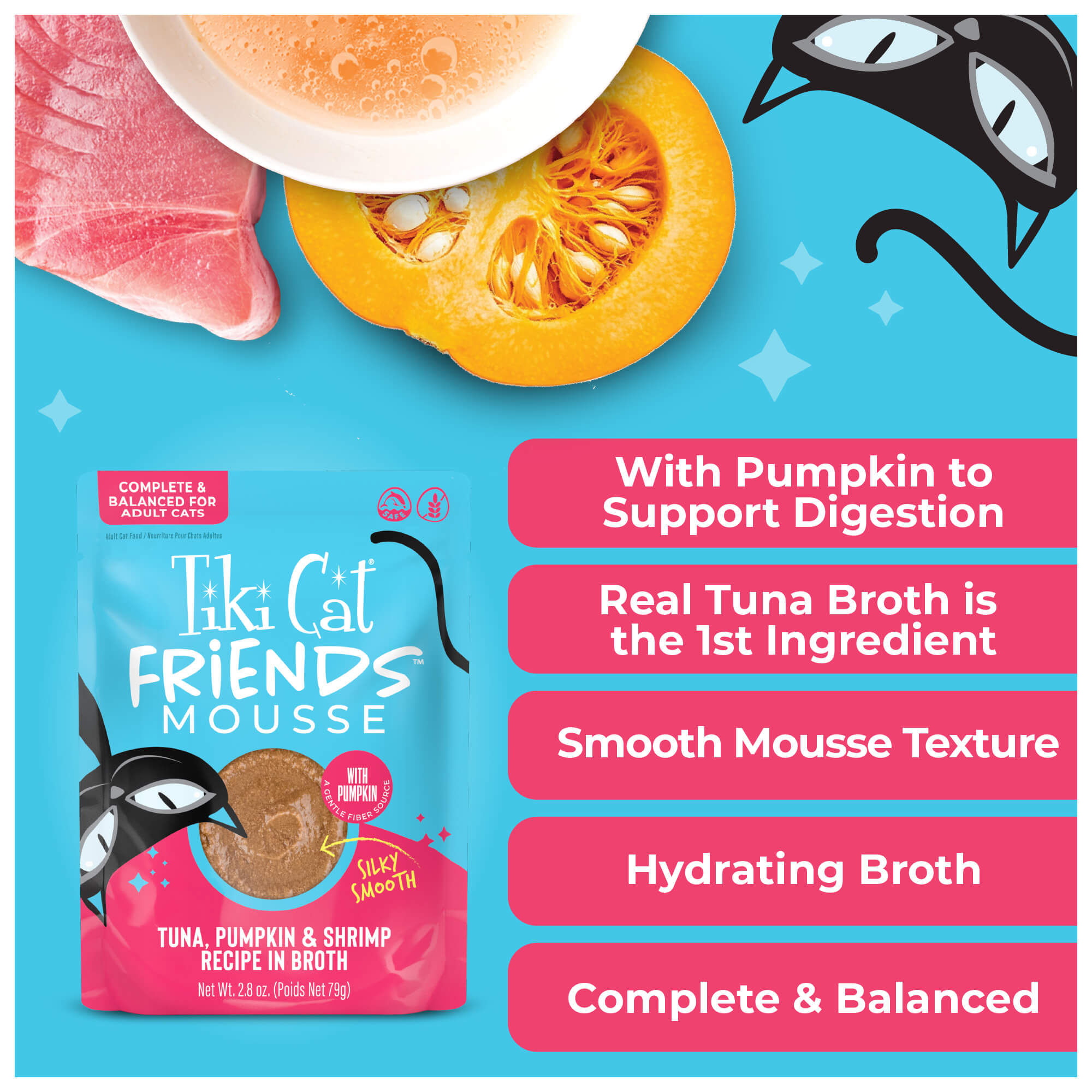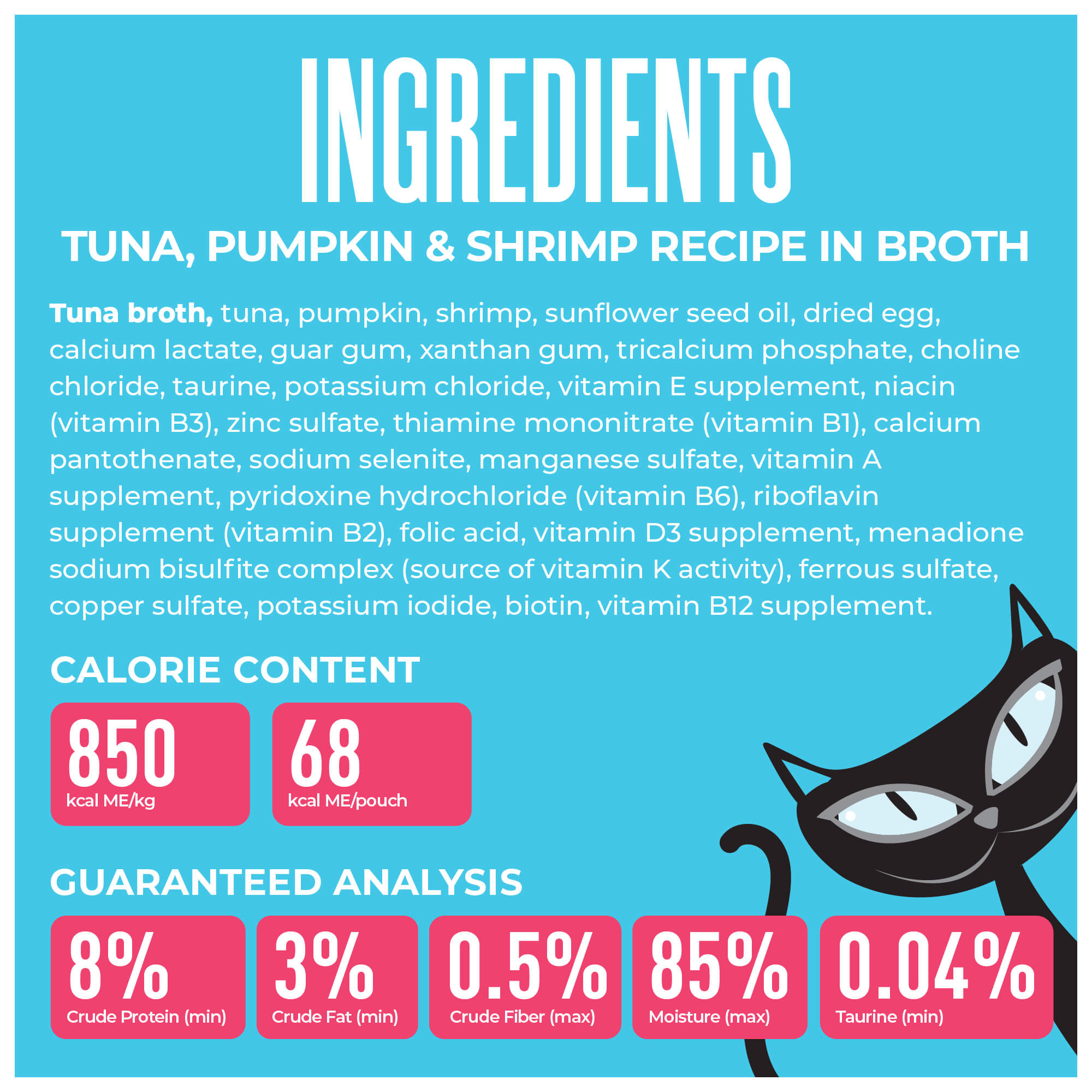 Tuna broth, tuna, pumpkin, shrimp, sunflower seed oil, dried egg, calcium lactate, guar gum, xanthan gum, tricalcium phosphate, choline chloride, taurine, potassium chloride, vitamin E supplement, niacin (vitamin B3), zinc sulfate, thiamine mononitrate (vitamin B1), calcium pantothenate, sodium selenite, manganese sulfate, vitamin A supplement, pyridoxine hydrochloride (vitamin B6), riboflavin supplement (vitamin B2), folic acid, vitamin D3 supplement, menadione sodium bisulfite complex (source of vitamin K activity), ferrous sulfate, copper sulfate, potassium iodide, biotin, vitamin B12 supplement.