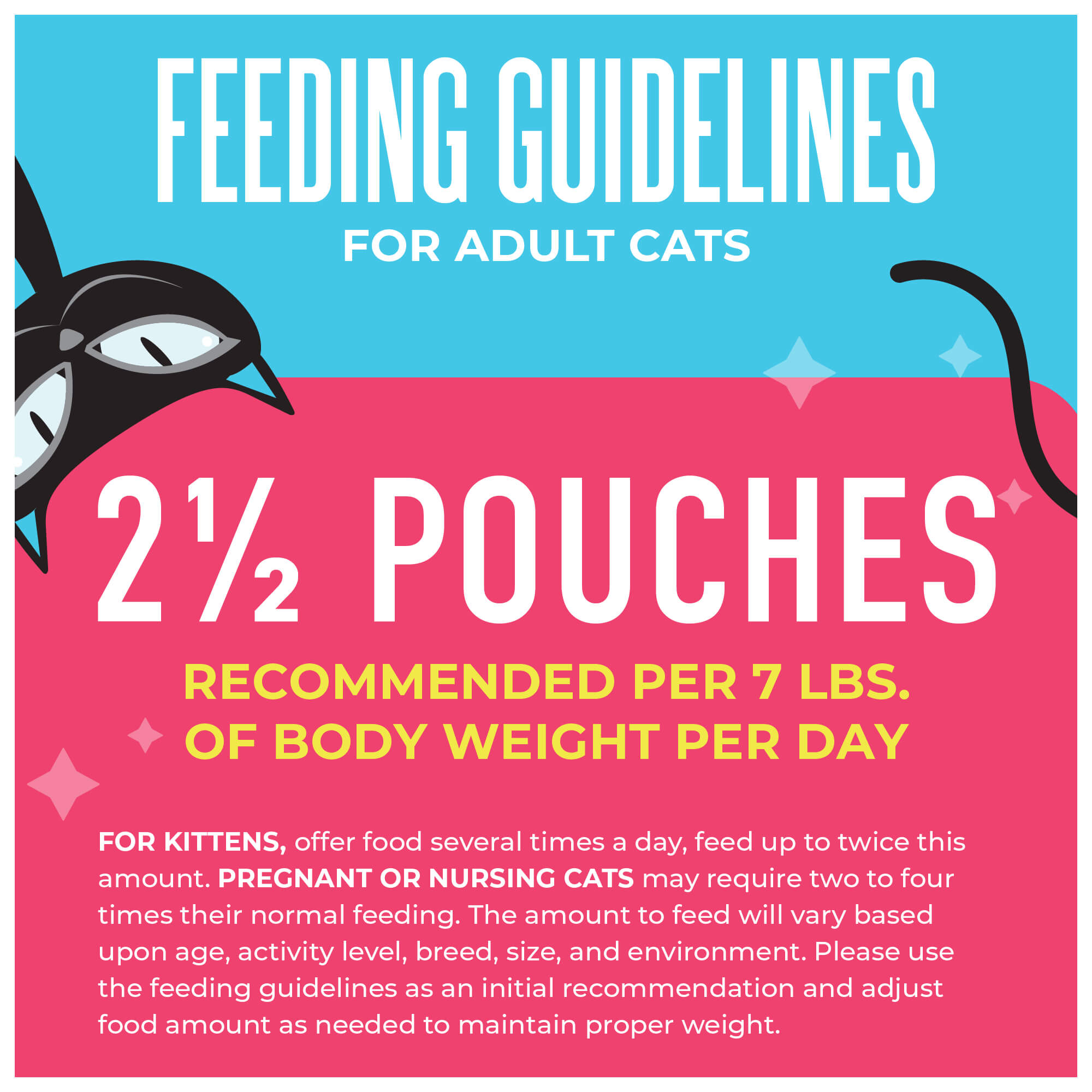 For adult cats, feed approximately 2 1/2 pouches per day per 7 lbs. of body weight.