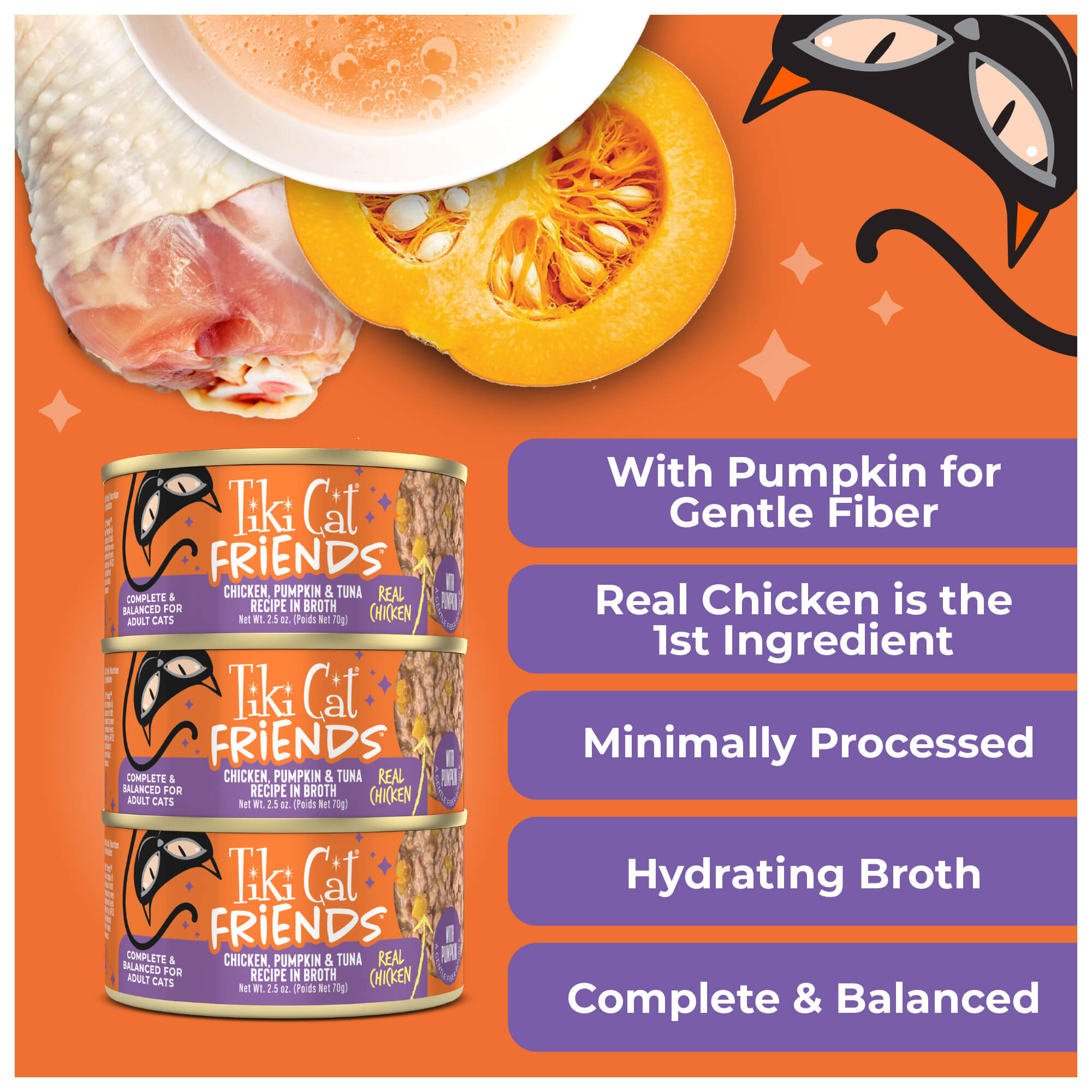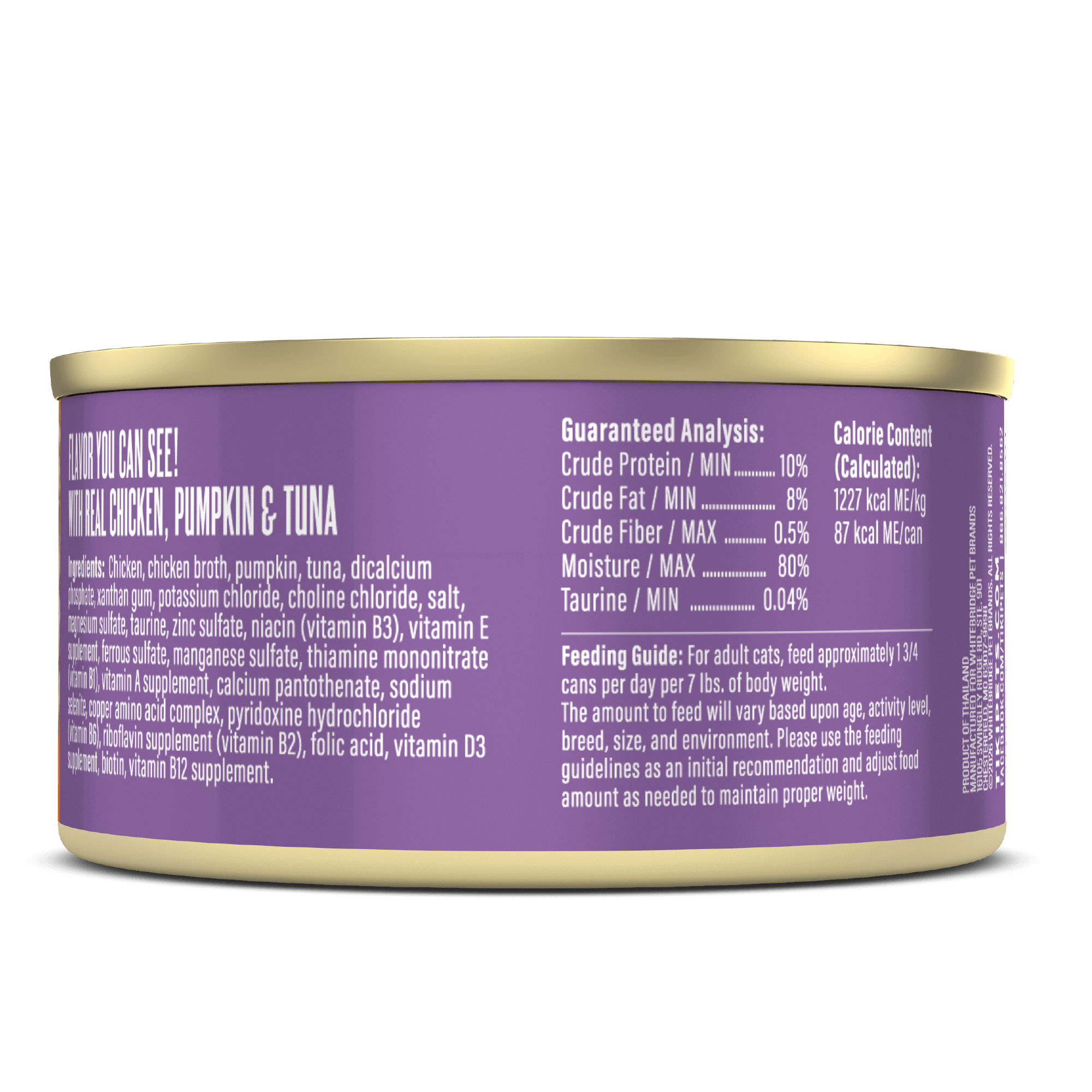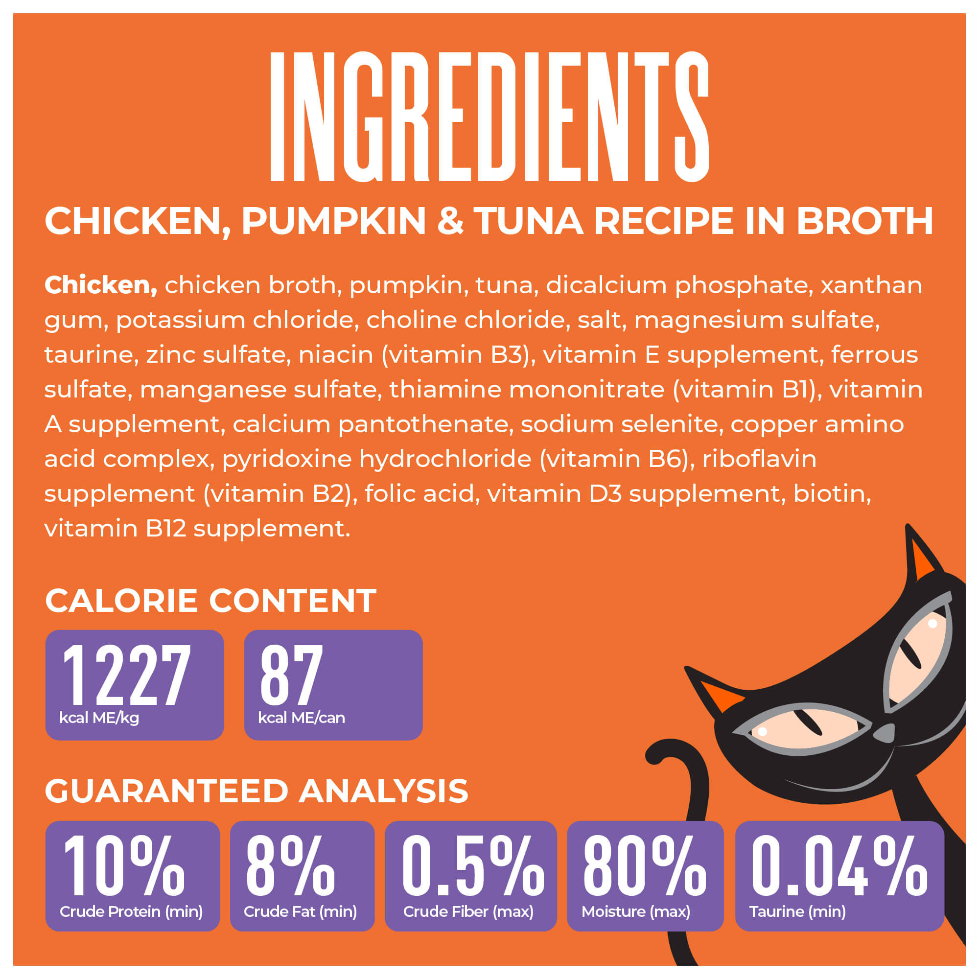 Chicken, chicken broth, pumpkin, tuna, dicalcium phosphate, xanthan gum, potassium chloride, choline chloride, salt, magnesium sulfate, taurine, zinc sulfate, niacin (vitamin B3), vitamin E supplement, ferrous sulfate, manganese sulfate, thiamine mononitrate (vitamin B1), vitamin A supplement, calcium pantothenate, sodium selenite, copper amino acid complex, pyridoxine hydrochloride (vitamin B6), riboflavin supplement (vitamin B2), folic acid, vitamin D3 supplement, biotin, vitamin B12 supplement.