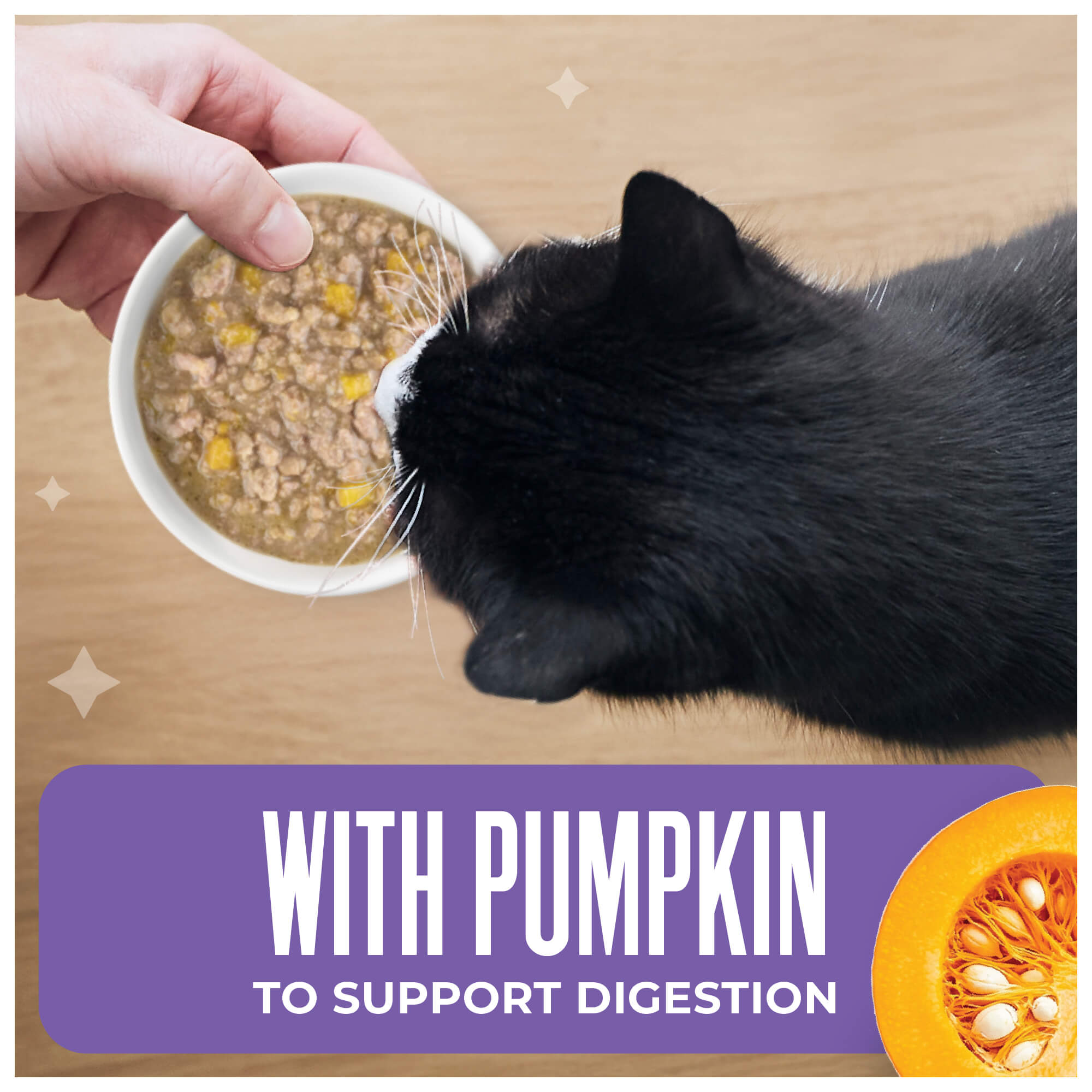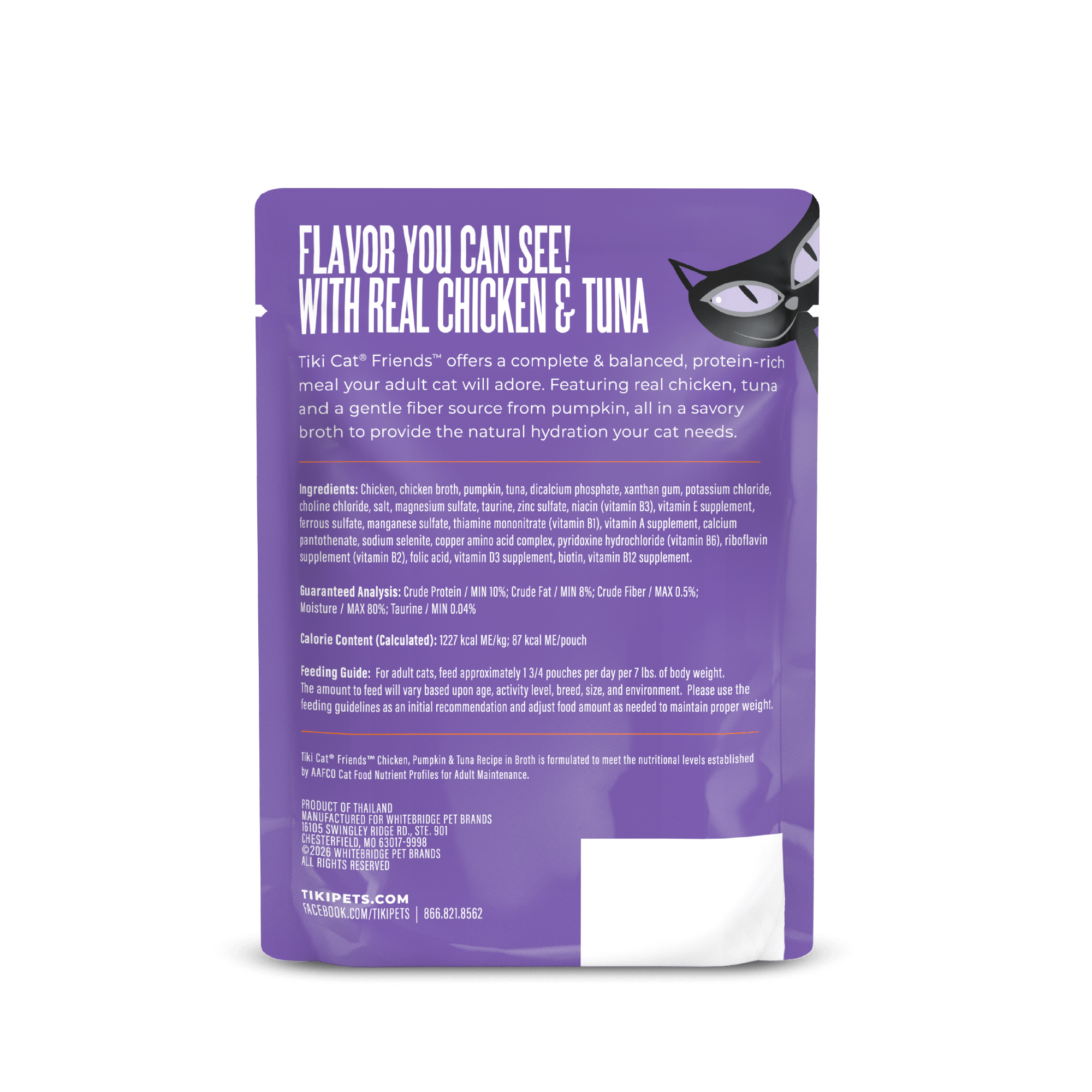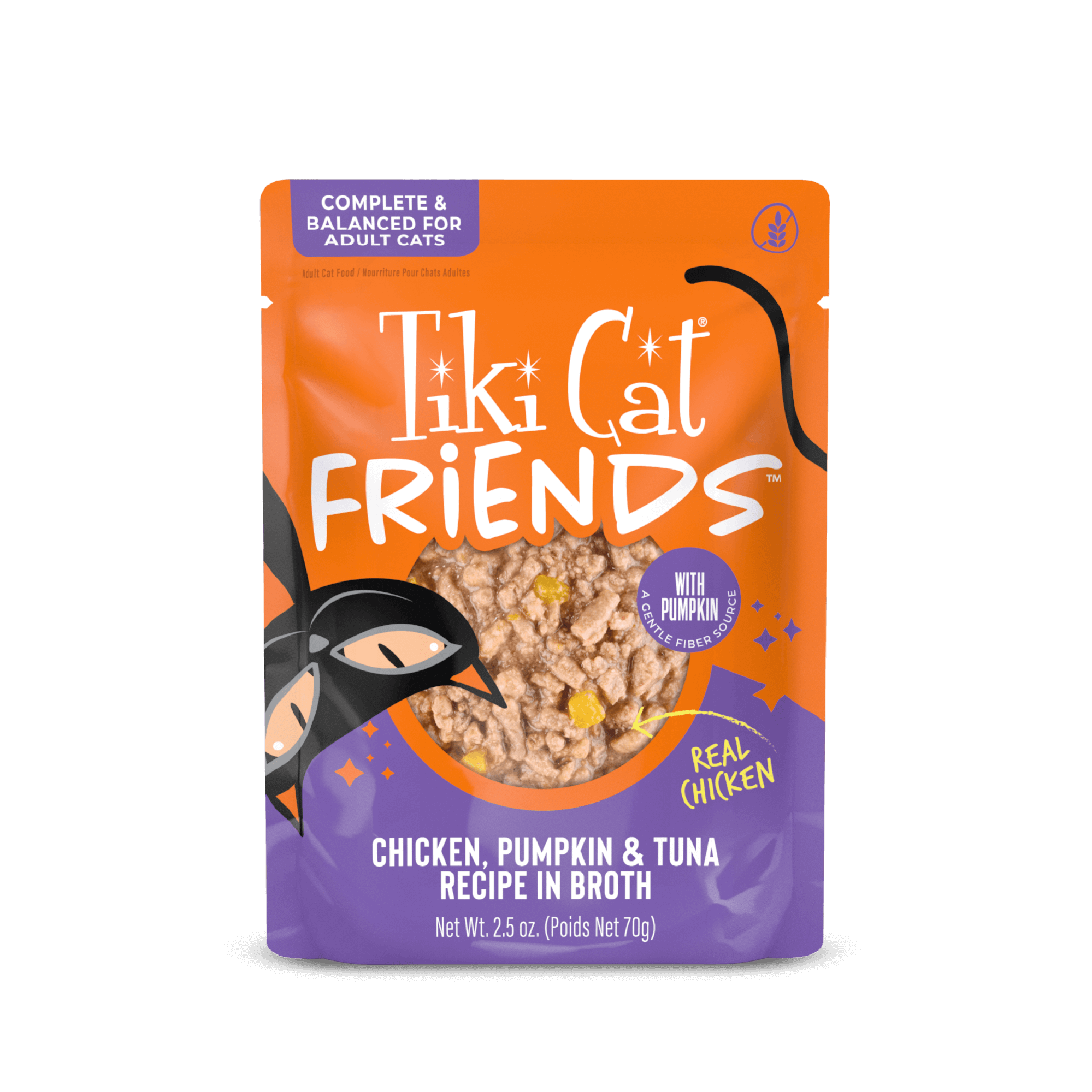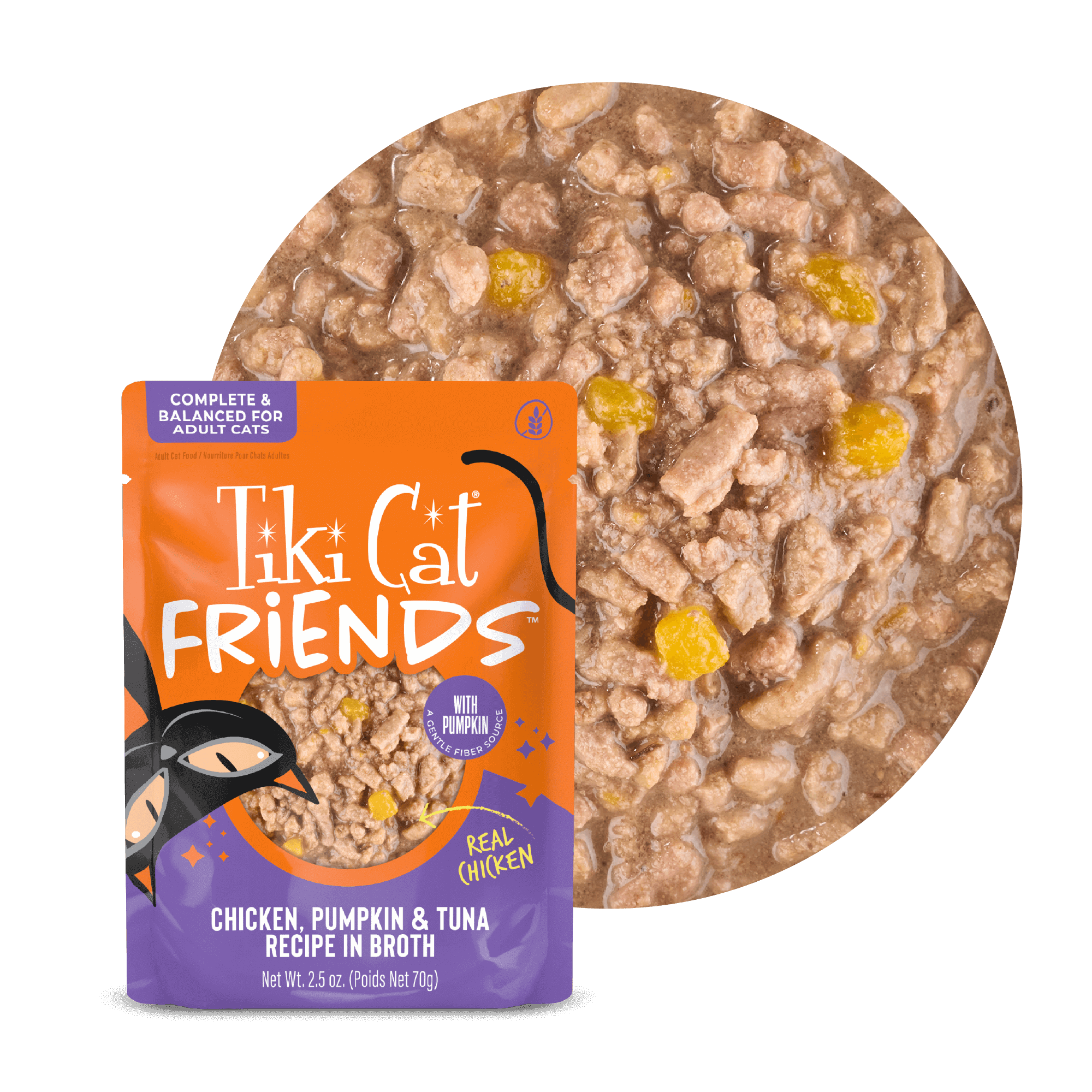 Chicken, chicken broth, pumpkin, tuna, dicalcium phosphate, xanthan gum, potassium chloride, choline chloride, salt, magnesium sulfate, taurine, zinc sulfate, niacin (vitamin B3), vitamin E supplement, ferrous sulfate, manganese sulfate, thiamine mononitrate (vitamin B1), vitamin A supplement, calcium pantothenate, sodium selenite, copper amino acid complex, pyridoxine hydrochloride (vitamin B6), riboflavin supplement (vitamin B2), folic acid, vitamin D3 supplement, biotin, vitamin B12 supplement.