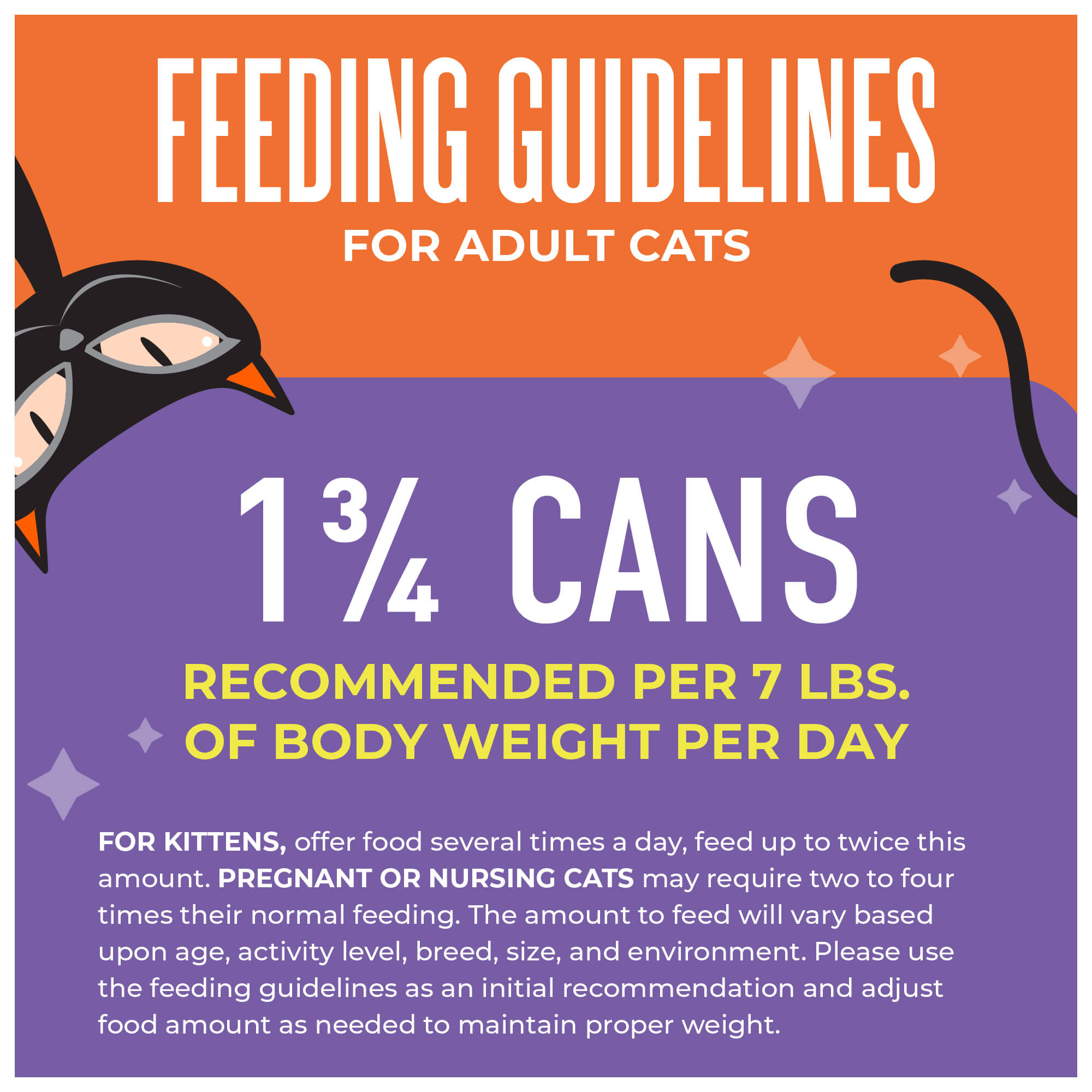 For adult cats, feed approximately 1 3/4 cans or pouches per day per 7 lbs. of body weight.