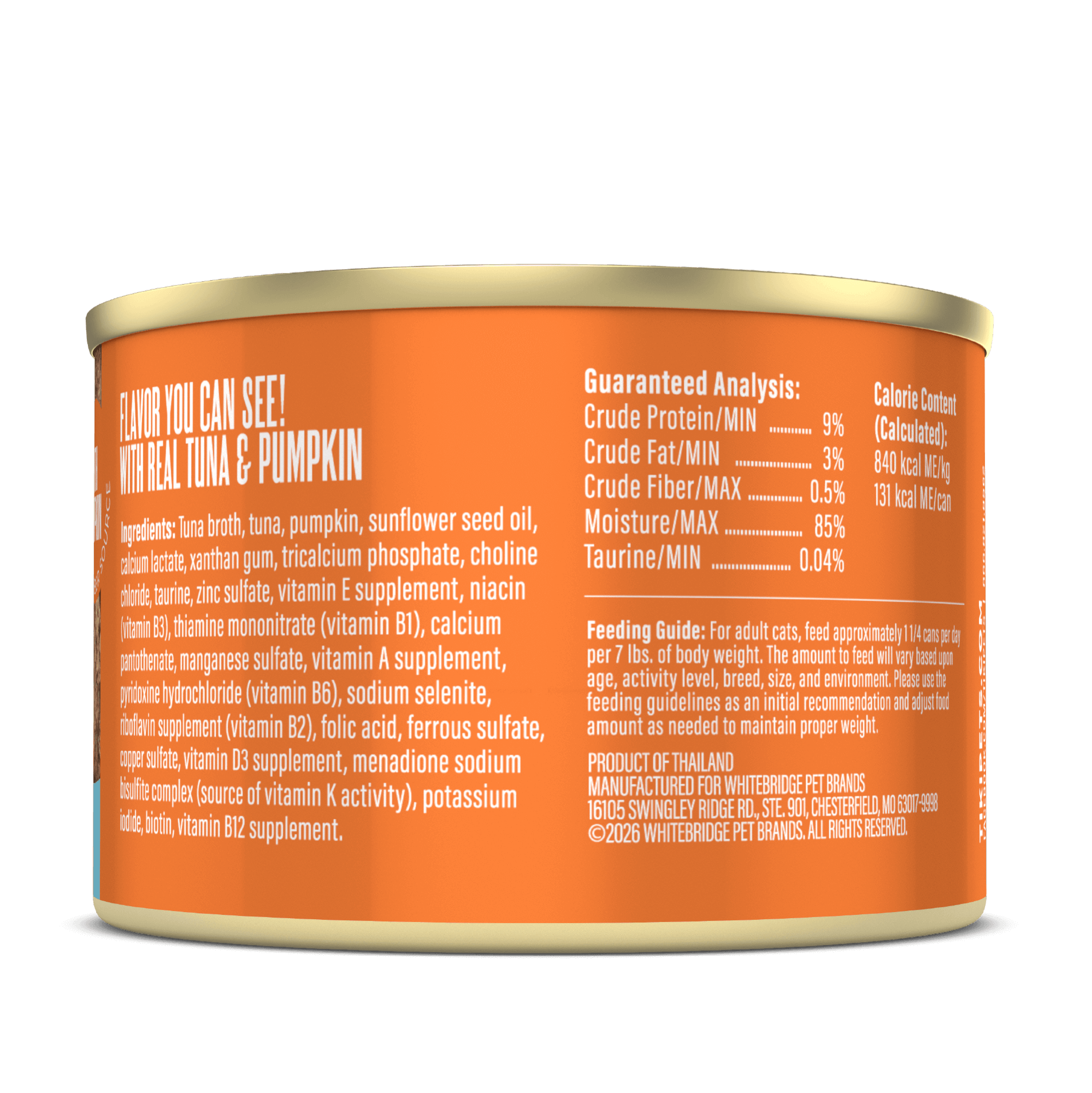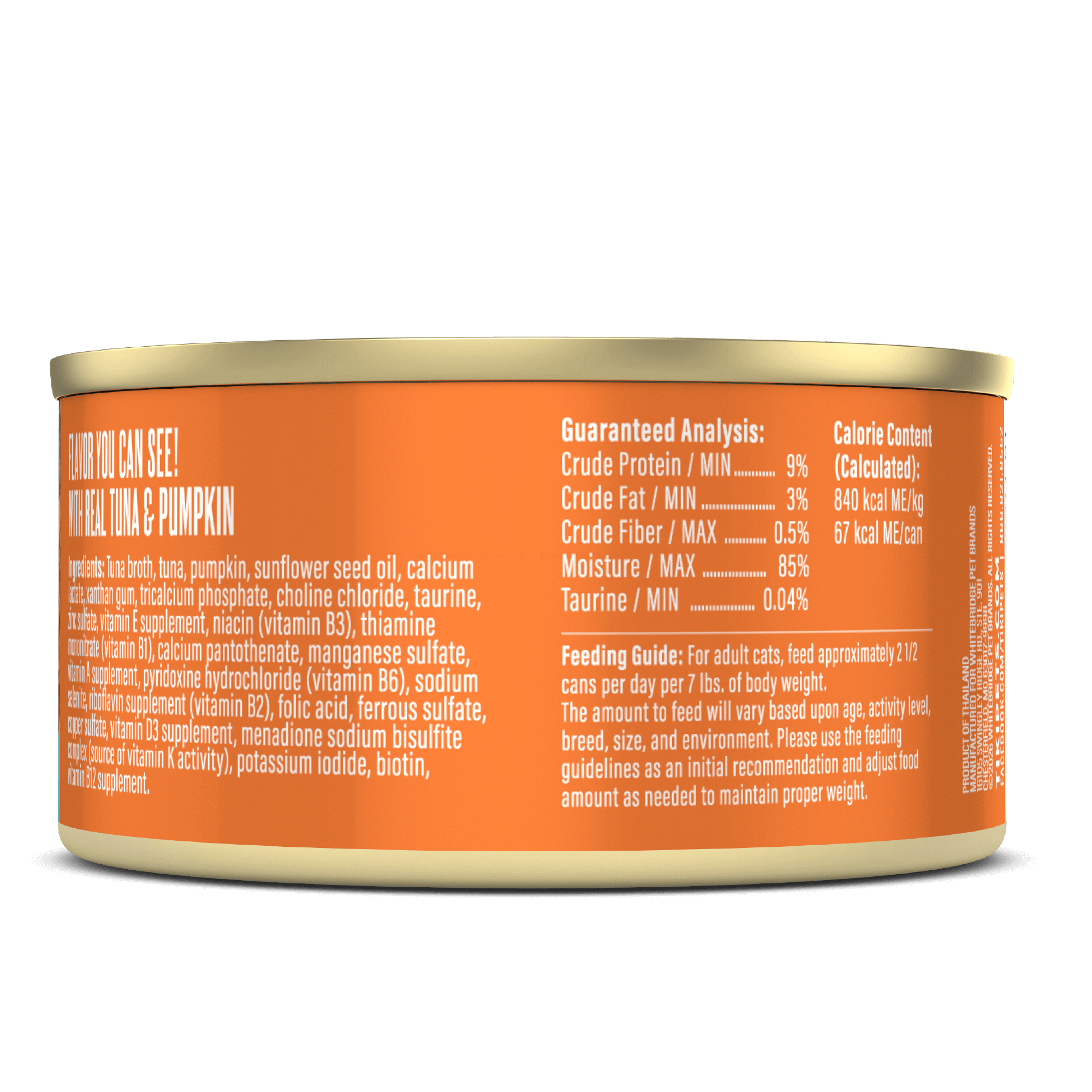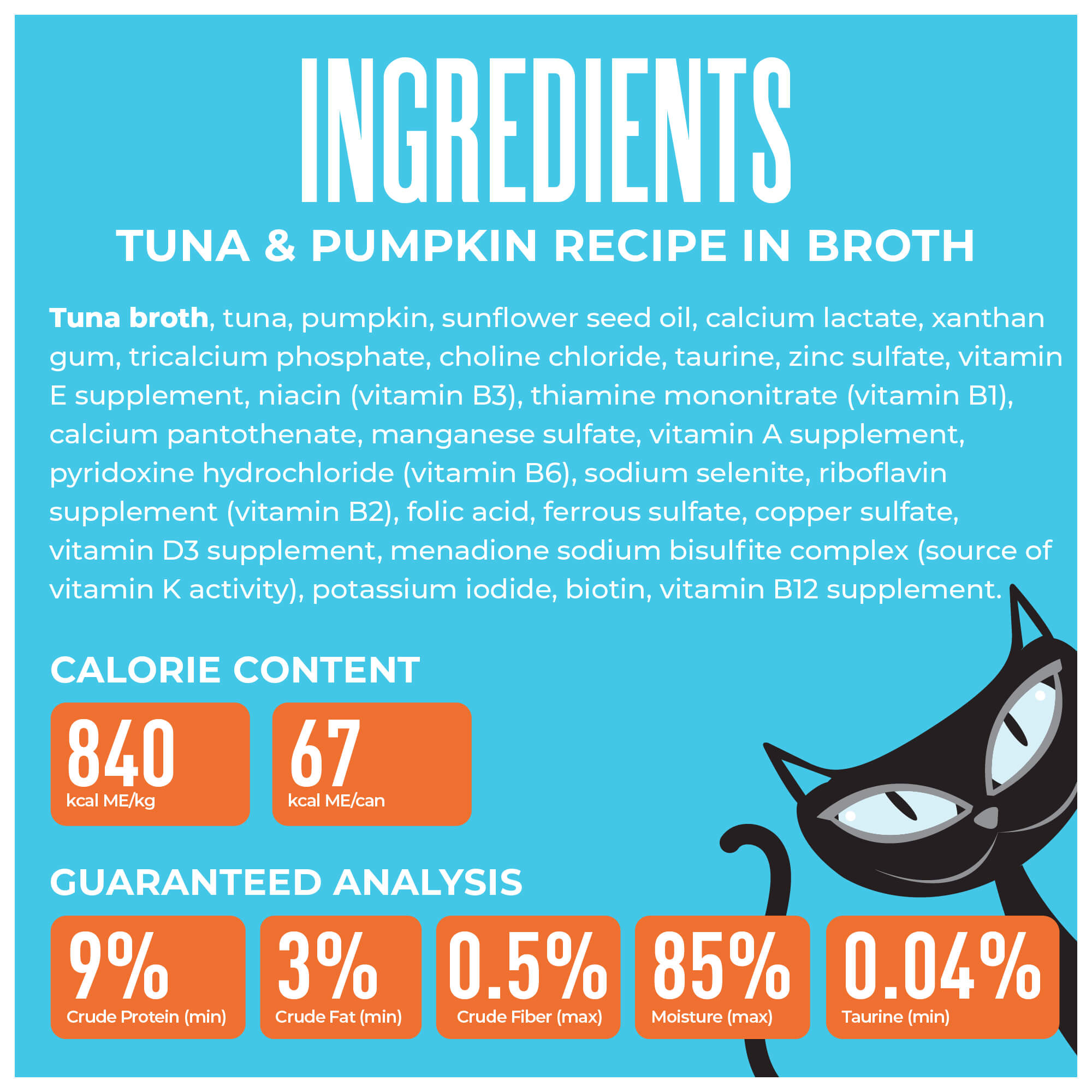 Tuna broth, tuna, pumpkin, sunflower seed oil, calcium lactate, xanthan gum, tricalcium phosphate, choline chloride, taurine, zinc sulfate, vitamin E supplement, niacin (vitamin B3), thiamine mononitrate (vitamin B1), calcium pantothenate, manganese sulfate, vitamin A supplement, pyridoxine hydrochloride (vitamin B6), sodium selenite, riboflavin supplement (vitamin B2), folic acid, ferrous sulfate, copper sulfate, vitamin D3 supplement, menadione sodium bisulfite complex (source of vitamin K activity), potassium iodide, biotin, vitamin B12 supplement.