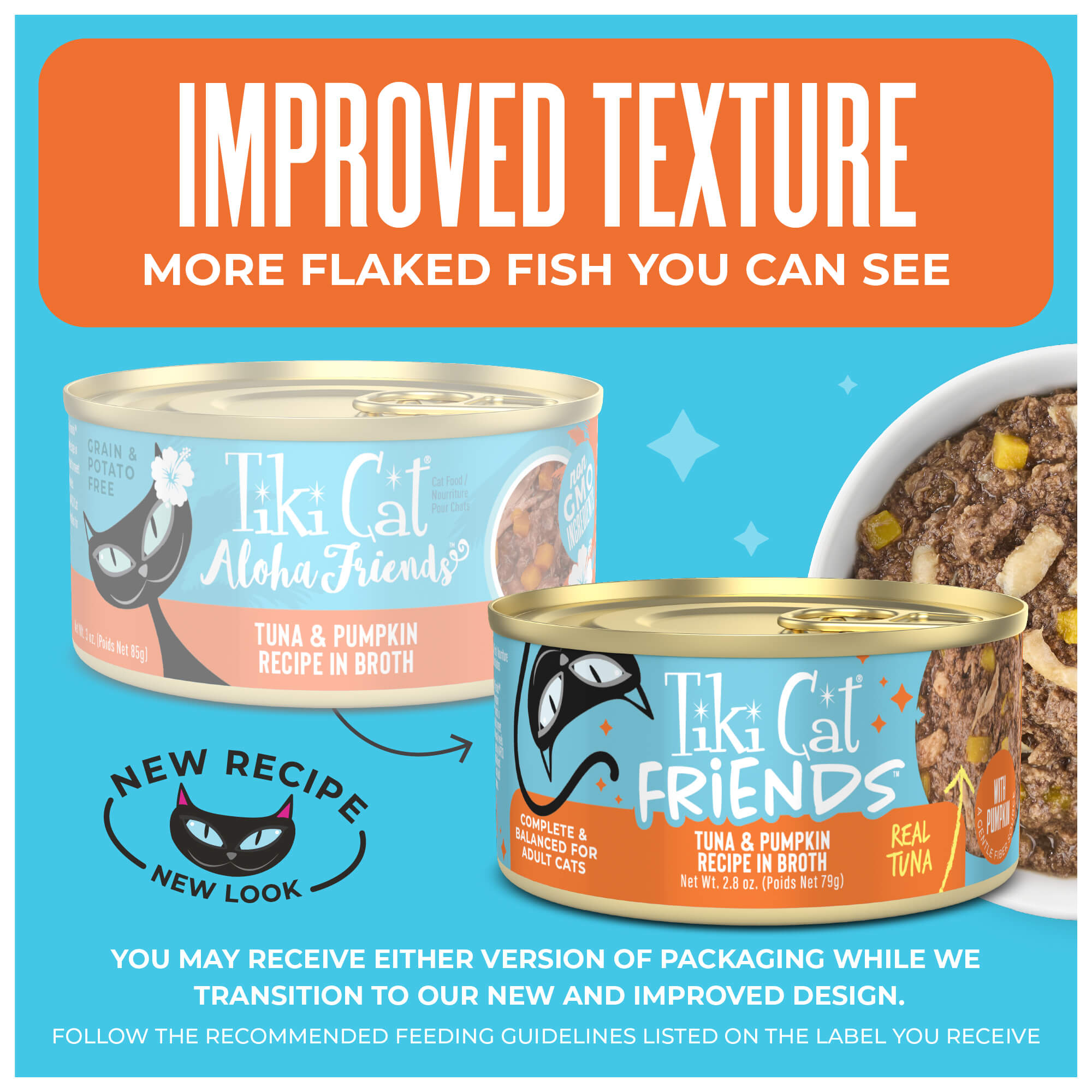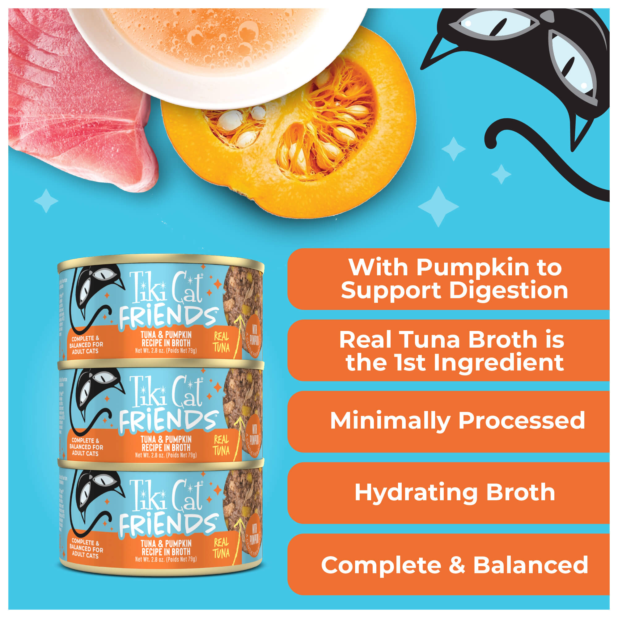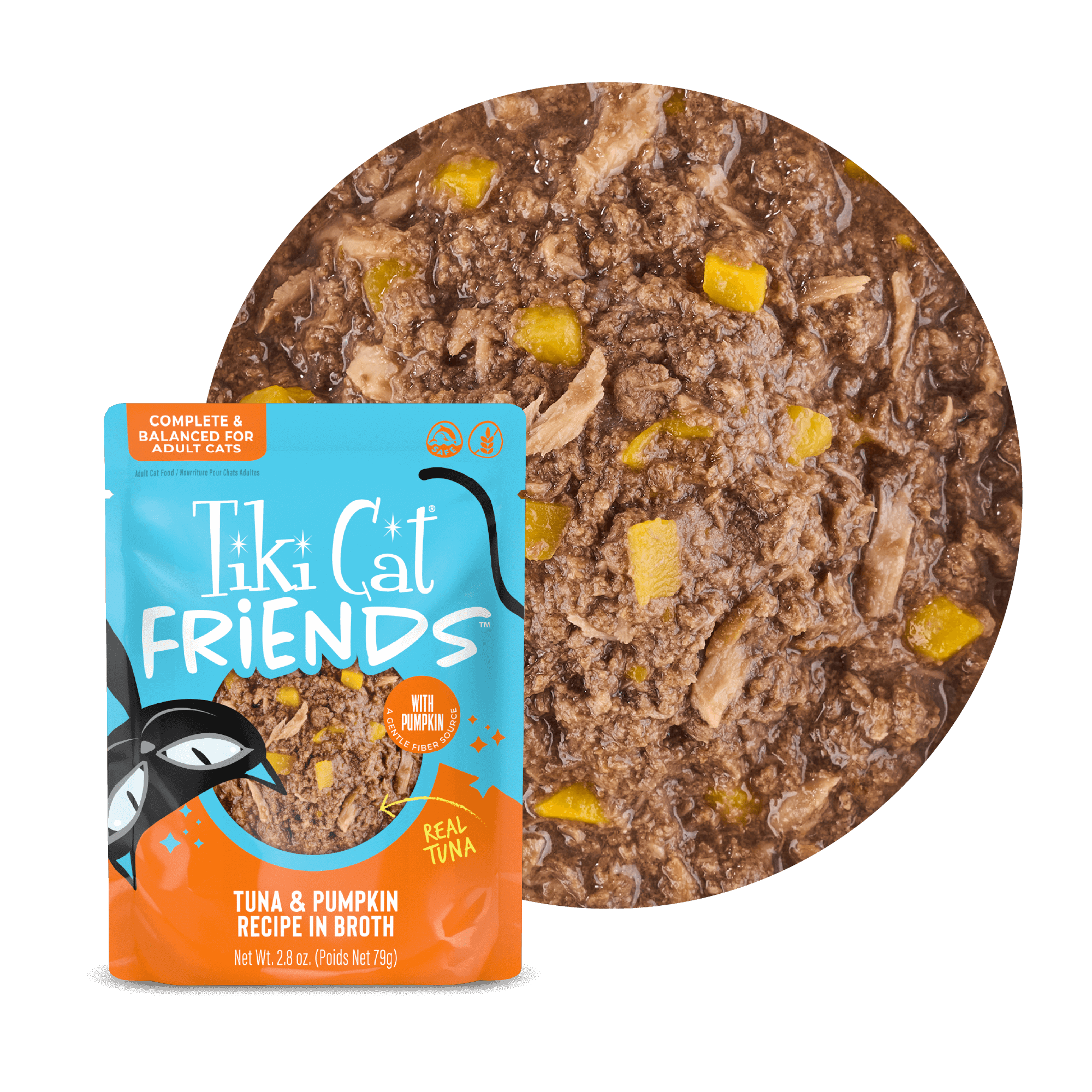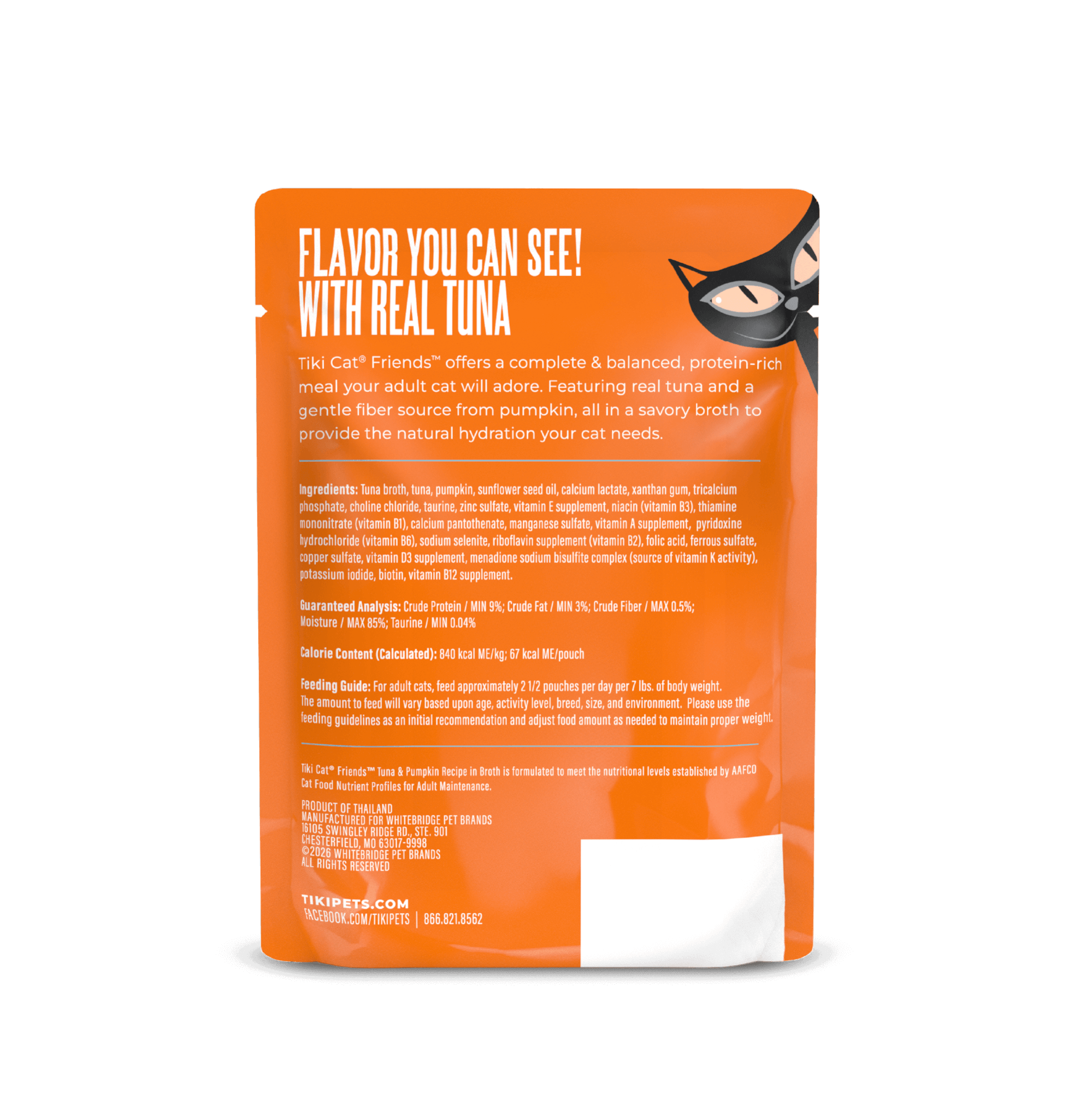 Tuna broth, tuna, pumpkin, sunflower seed oil, calcium lactate, xanthan gum, tricalcium phosphate, choline chloride, taurine, zinc sulfate, vitamin E supplement, niacin (vitamin B3), thiamine mononitrate (vitamin B1), calcium pantothenate, manganese sulfate, vitamin A supplement, pyridoxine hydrochloride (vitamin B6), sodium selenite, riboflavin supplement (vitamin B2), folic acid, ferrous sulfate, copper sulfate, vitamin D3 supplement, menadione sodium bisulfite complex (source of vitamin K activity), potassium iodide, biotin, vitamin B12 supplement.