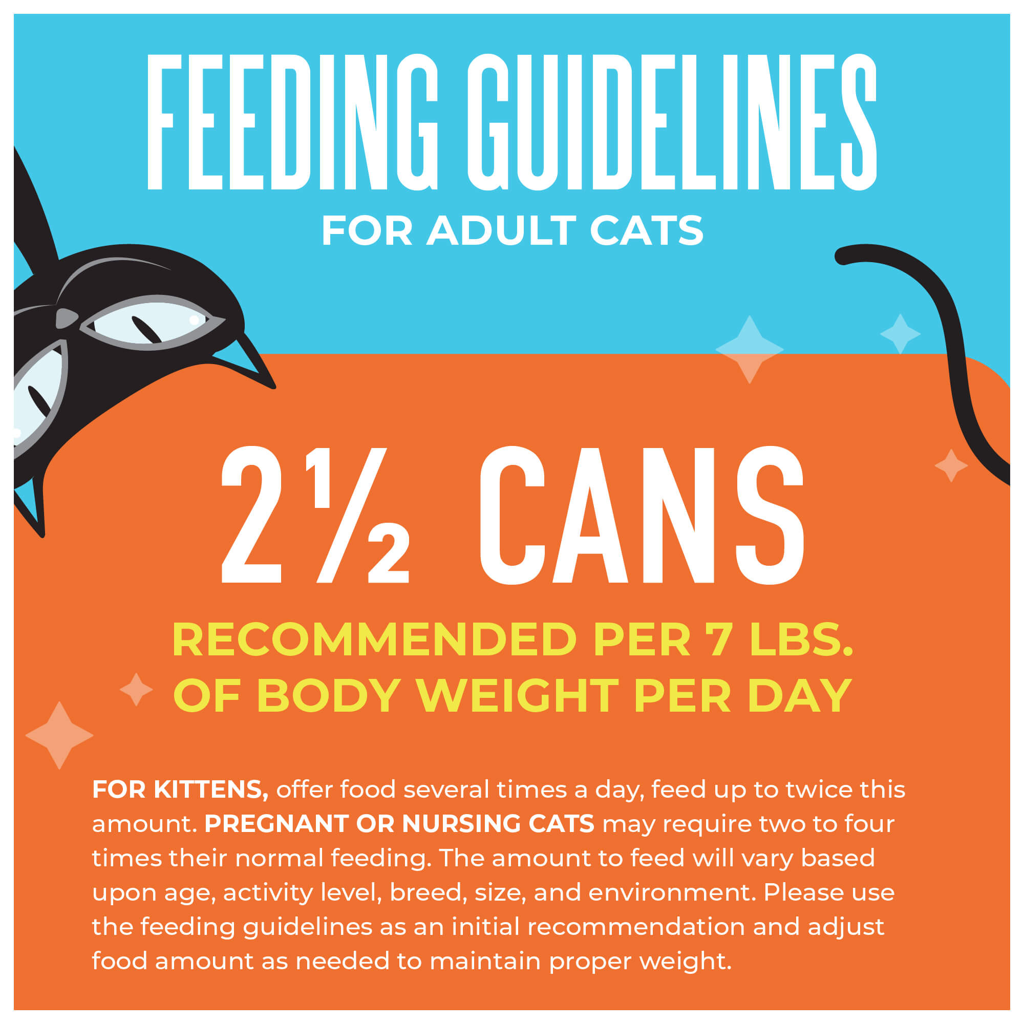 For adult cats, feed approximately 2 1/2 2.8 oz cans per day per 7 lbs. of body weight.